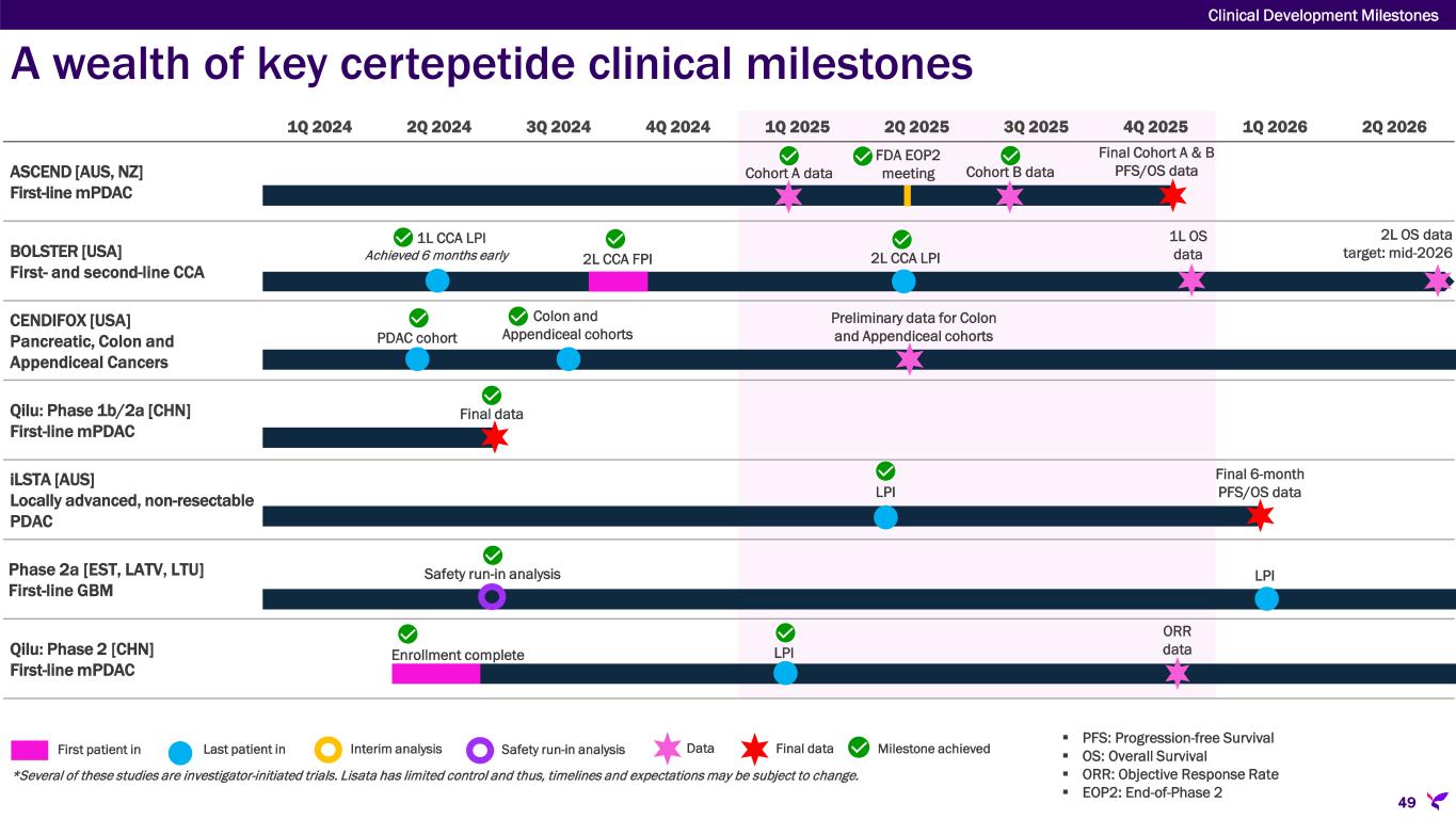 A wealth of key certepetide clinical milestones Clinical Development Milestones 49 1Q 2024 2Q 2024 3Q 2024 4Q 2024 1Q 2025 2Q 2025 3Q 2025 4Q 2025 1Q 2026 2Q 2026 ASCEND [AUS, NZ] First-line mPDAC BOLSTER [USA] First- and second-line CCA CENDIFOX [USA] Pancreatic, Colon and Appendiceal Cancers Qilu: Phase 1b/2a [CHN] First-line mPDAC iLSTA [AUS] Locally advanced, non-resectable PDAC Phase 2a [EST, LATV, LTU] First-line GBM Qilu: Phase 2 [CHN] First-line mPDAC *Several of these studies are investigator-initiated trials. Lisata has limited control and thus, timelines and expectations may be subject to change.  PFS: Progression-free Survival  OS: Overall Survival  ORR: Objective Response Rate  EOP2: End-of-Phase 2 First patient in Last patient in Interim analysis Data Final data Milestone achievedSafety run-in analysis Cohort A data Final Cohort A & B PFS/OS data FDA EOP2 meeting Cohort B data 1L CCA LPI Achieved 6 months early 2L CCA FPI 2L CCA LPI 1L OS data 2L OS data target: mid-2026 PDAC cohort Colon and Appendiceal cohorts Preliminary data for Colon and Appendiceal cohorts Final data LPI Final 6-month PFS/OS data Safety run-in analysis LPI Enrollment complete LPI ORR data