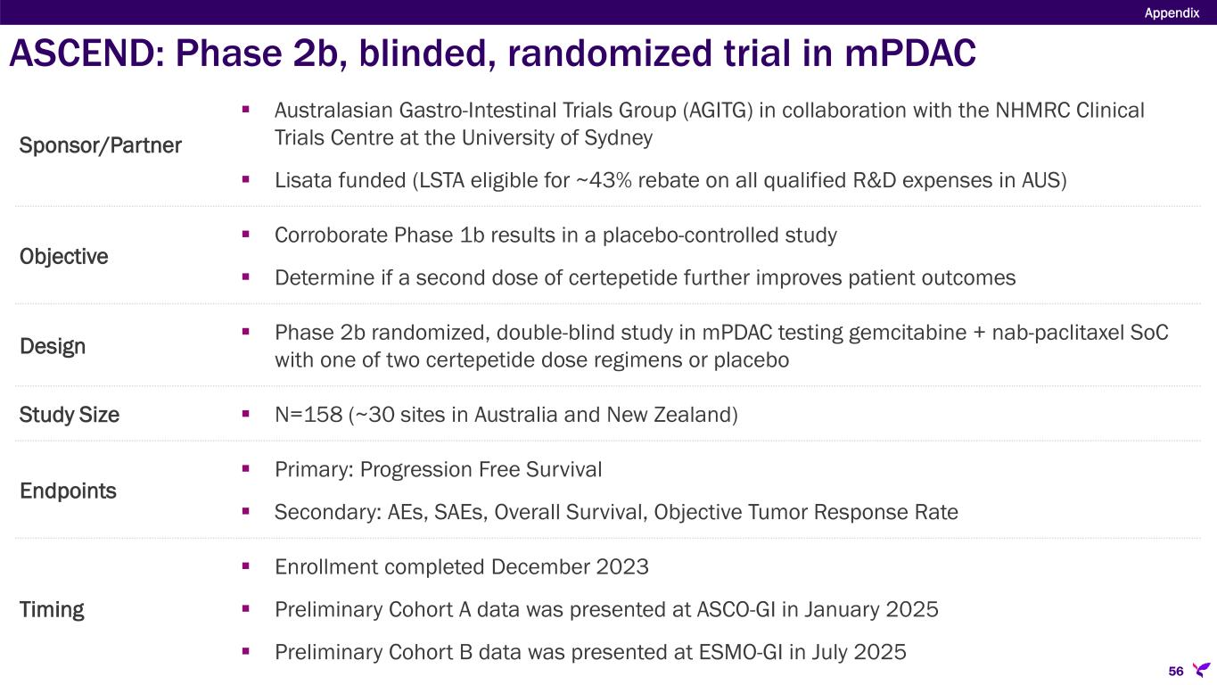ASCEND: Phase 2b, blinded, randomized trial in mPDAC 56 Appendix Sponsor/Partner  Australasian Gastro-Intestinal Trials Group (AGITG) in collaboration with the NHMRC Clinical Trials Centre at the University of Sydney  Lisata funded (LSTA eligible for ~43% rebate on all qualified R&D expenses in AUS) Objective  Corroborate Phase 1b results in a placebo-controlled study  Determine if a second dose of certepetide further improves patient outcomes Design  Phase 2b randomized, double-blind study in mPDAC testing gemcitabine + nab-paclitaxel SoC with one of two certepetide dose regimens or placebo Study Size  N=158 (~30 sites in Australia and New Zealand) Endpoints  Primary: Progression Free Survival  Secondary: AEs, SAEs, Overall Survival, Objective Tumor Response Rate Timing  Enrollment completed December 2023  Preliminary Cohort A data was presented at ASCO-GI in January 2025  Preliminary Cohort B data was presented at ESMO-GI in July 2025