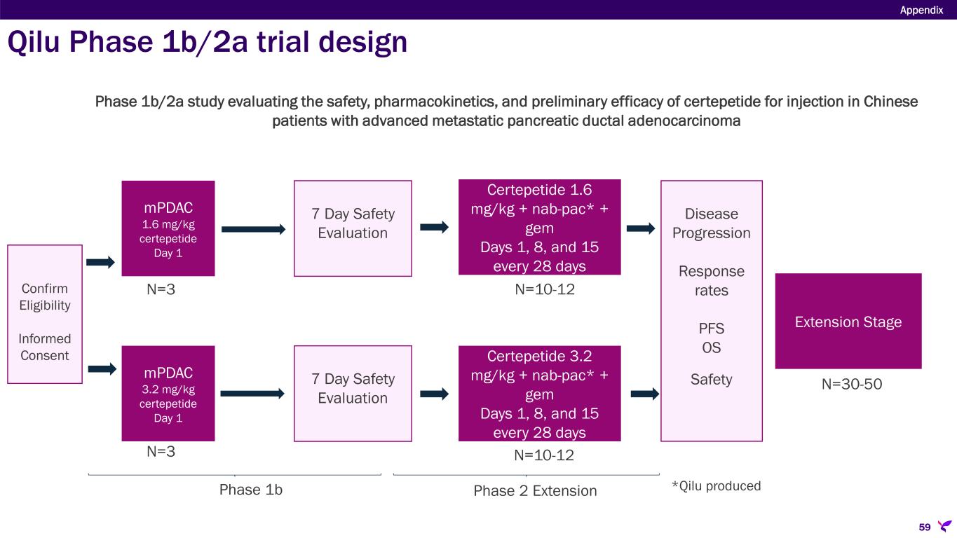 7 Day Safety Evaluation Certepetide 1.6 mg/kg + nab-pac* + gem Days 1, 8, and 15 every 28 days Confirm Eligibility Informed Consent Extension Stage mPDAC 1.6 mg/kg certepetide Day 1 Phase 1b/2a study evaluating the safety, pharmacokinetics, and preliminary efficacy of certepetide for injection in Chinese patients with advanced metastatic pancreatic ductal adenocarcinoma mPDAC 3.2 mg/kg certepetide Day 1 7 Day Safety Evaluation Certepetide 3.2 mg/kg + nab-pac* + gem Days 1, 8, and 15 every 28 days Phase 1b N=3 N=3 Phase 2 Extension N=10-12 N=10-12 N=30-50 Disease Progression Response rates PFS OS Safety *Qilu produced Qilu Phase 1b/2a trial design Appendix 59