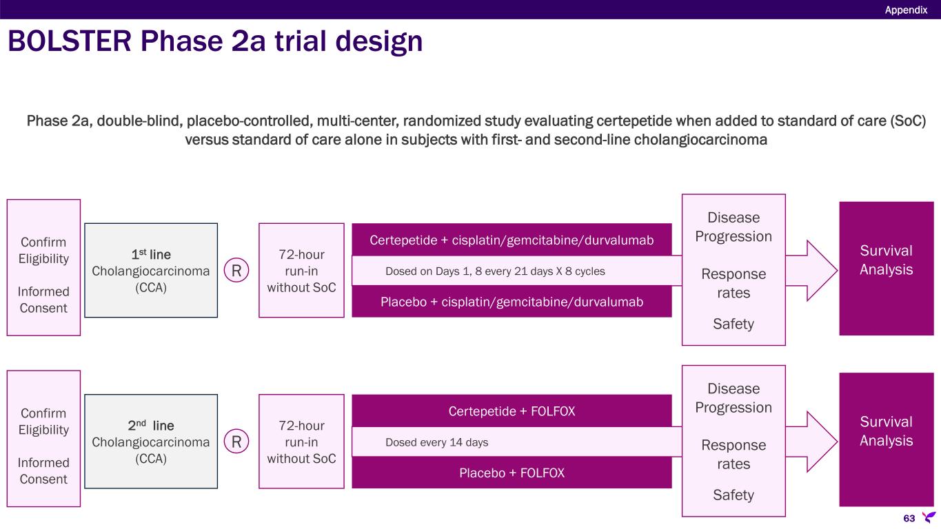 Sponsor/Partner  Lisata (U.S.) Objective  Evaluate the preliminary efficacy, safety and tolerability of certepetide in combination with standards of care in subjects with first- and second-line cholangiocarcinoma Design  Phase 2 randomized, double-blind, placebo-controlled, proof-of-concept trial in first- and second-line cholangiocarcinoma testing corresponding SoC with certepetide or placebo Study Size  N=69 (1L: N=47, 2L: N=22)  1:1 SoC + certepetide or SoC + placebo Endpoints  Primary: OS  Secondary: Safety, ORR, PFS Timing  Enrollment completed for 1L and 2L CCA BOLSTER: Phase 2 blinded, randomized trial in cholangiocarcinoma Appendix 62