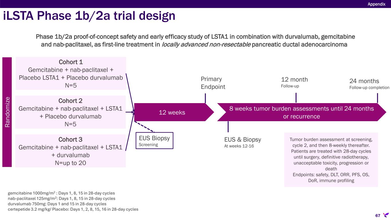 Sponsor/Partner  WARPNINE, Inc. (registered charity in Australia) is funding trial  Lisata providing study drug Objective  Evaluate safety and therapeutic effect of LSTA1 in combination with IO & Chemo in locally advanced non-resectable pancreatic ductal adenocarcinoma (PDAC); determine if inoperable tumors can become operable Design  Phase 1b/2a proof-of-concept safety and early efficacy study of LSTA1 in combination with durvalumab, gemcitabine and nab-paclitaxel, as first-line treatment in locally advanced non-resectable pancreatic adenocarcinoma Study Size  N=30 Endpoints  Safety and tolerability; 28-day DLTs  Objective response rate, PFS, OS, duration of response, immune cell infiltration Timing  Final 6-month PFS/OS data expected 1Q 2026  Preliminary data presented at ASCO-GI (January 2025), with updated data consistent with previous findings presented at ESMO-GI (July 2025) Appendix 66 iLSTA: Phase 1b/2a trial in locally advanced PDAC with chemo & IO