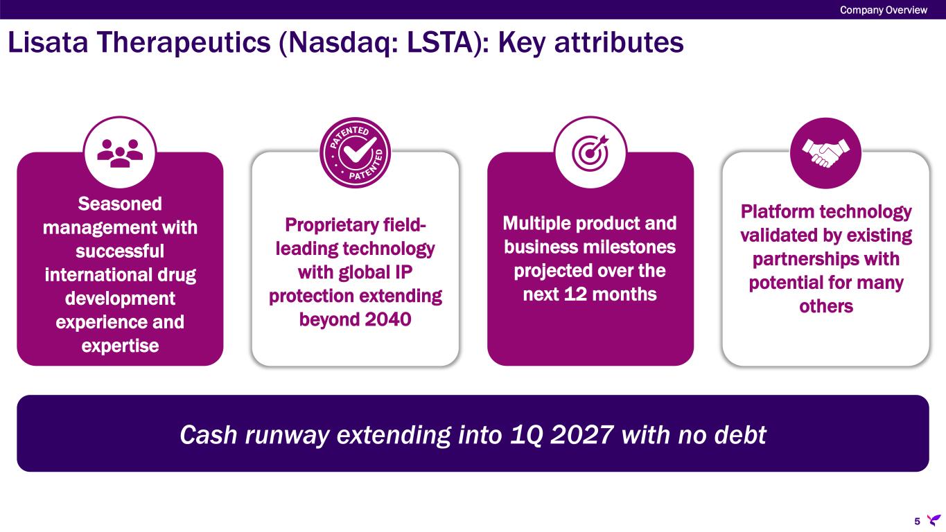 Lisata Therapeutics (Nasdaq: LSTA) Company Overview 4 OVERVIEW Clinical stage pharmaceutical company developing innovative therapies for the treatment of cancer and other serious diseases. MISSION To rapidly develop and commercialize innovative treatments that improve outcomes for patients with cancer or other serious diseases.
