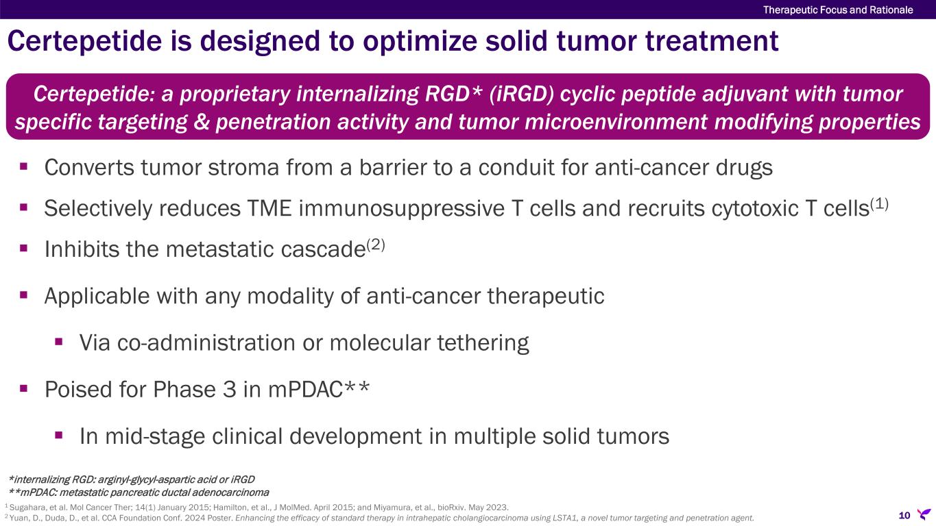Certepetide/iRGD consistently improves immunotherapy efficacy in multiple preclinical solid tumor models 18 Solid Tumor Types  Intrahepatic cholangiocarcinoma  Pancreatic adenocarcinoma  Prostate cancer  Breast cancer  Non-Small Cell Lung Cancer  Gastric cancer  Hepatocellular carcinoma Preclinical Observations  Improved overall survival  Reduced tumor size  Reduced and/or inhibited metastases Certepetide - Strong Scientific Foundation Sugahara, K., et al. bioRxiv 2023.05.24.542137; doi: https://doi.org/10.1101/2023.05.24.542137 Yuan, D., Duda, D., et al. 2024 CCA Foundation Conference. Poster: Enhancing the efficacy of standard therapy in intrahepatic cholangiocarcinoma using LSTA1, a novel tumor targeting and penetration agent. Sugahara, et al. 2015; Sugahara, et al. 2010 Yang, et al. 2019a; Yang, et al. 2019b Zhang et al 2016b Dong, et al. 2023 AACR 2025 Abstracts: • Kim, M., Sugahara, K., et al. iRGD peptide therapy transforms immunosuppressive microenvironment to immune-favorable state in pancreatic ductal adenocarcinoma (https://www.abstractsonline.com/pp8/#!/20273/presentation/5422). • Miyamura, N., Sugahara, K., et al. A cytotoxic peptide designed for tumor-targeted delivery of co-injected molecules (https://www.abstractsonline.com/pp8/#!/20273/presentation/3881). • Kuroda, Y., Sugahara, K., et al. The iRGD tumor-penetrating peptide inhibits TGF-β activation mediated by an αvβ5 integrin-rich tumor microenvironment in pancreatic cancer (https://www.abstractsonline.com/pp8/#!/20273/presentation/5404). • Choi, Y., Sugahara, K., et al. Altered collagen morphology in pancreatic cancer treated with the iRGD tumor-penetrating peptide (https://www.abstractsonline.com/pp8/#!/20273/presentation/5419).