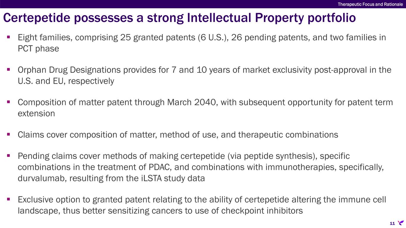Certepetide is designed to optimize solid tumor treatment 1 Sugahara, et al. Mol Cancer Ther; 14(1) January 2015; Hamilton, et al., J MolMed. April 2015; and Miyamura, et al., bioRxiv. May 2023. 2 Yuan, D., Duda, D., et al. CCA Foundation Conf. 2024 Poster. Enhancing the efficacy of standard therapy in intrahepatic cholangiocarcinoma using LSTA1, a novel tumor targeting and penetration agent.  Converts tumor stroma from a barrier to a conduit for anti-cancer drugs  Selectively reduces TME immunosuppressive T cells and recruits cytotoxic T cells(1)  Inhibits the metastatic cascade(2)  Applicable with any modality of anti-cancer therapeutic  Via co-administration or molecular tethering  Poised for Phase 3 in mPDAC**  In mid-stage clinical development in multiple solid tumors Certepetide: a proprietary internalizing RGD* (iRGD) cyclic peptide adjuvant with tumor specific targeting & penetration activity and tumor microenvironment modifying properties *internalizing RGD: arginyl-glycyl-aspartic acid or iRGD **mPDAC: metastatic pancreatic ductal adenocarcinoma 10 Therapeutic Focus and Rationale