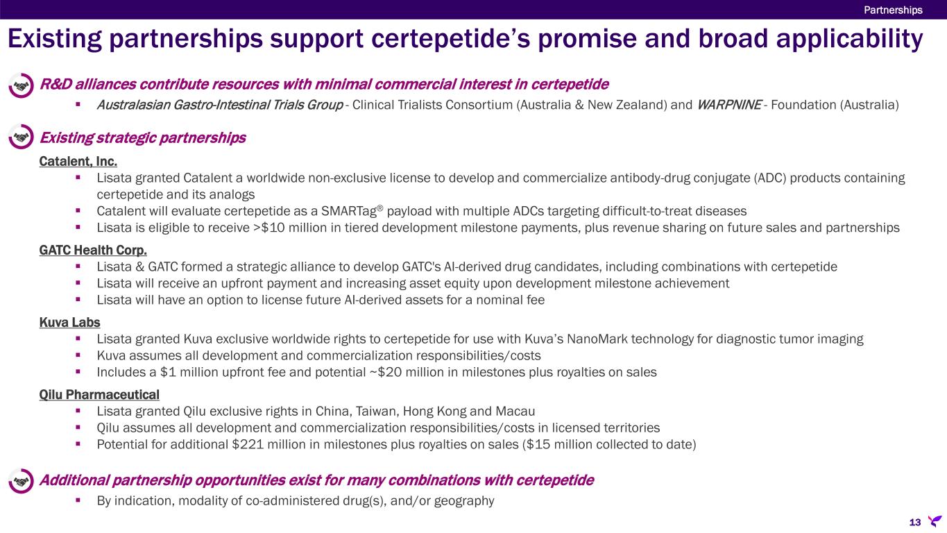 Existing partnerships support certepetide’s promise and broad applicability Partnerships 13 R&D alliances contribute resources with minimal commercial interest in certepetide  Australasian Gastro-Intestinal Trials Group - Clinical Trialists Consortium (Australia & New Zealand) and WARPNINE - Foundation (Australia) Existing strategic partnerships Catalent, Inc.  Lisata granted Catalent a worldwide non-exclusive license to develop and commercialize antibody-drug conjugate (ADC) products containing certepetide and its analogs  Catalent will evaluate certepetide as a SMARTag® payload with multiple ADCs targeting difficult-to-treat diseases  Lisata is eligible to receive >$10 million in tiered development milestone payments, plus revenue sharing on future sales and partnerships GATC Health Corp.  Lisata & GATC formed a strategic alliance to develop GATC's AI-derived drug candidates, including combinations with certepetide  Lisata will receive an upfront payment and increasing asset equity upon development milestone achievement  Lisata will have an option to license future AI-derived assets for a nominal fee Kuva Labs  Lisata granted Kuva exclusive worldwide rights to certepetide for use with Kuva’s NanoMark technology for diagnostic tumor imaging  Kuva assumes all development and commercialization responsibilities/costs  Includes a $1 million upfront fee and potential ~$20 million in milestones plus royalties on sales Qilu Pharmaceutical  Lisata granted Qilu exclusive rights in China, Taiwan, Hong Kong and Macau  Qilu assumes all development and commercialization responsibilities/costs in licensed territories  Potential for additional $221 million in milestones plus royalties on sales ($15 million collected to date) Additional partnership opportunities exist for many combinations with certepetide  By indication, modality of co-administered drug(s), and/or geography