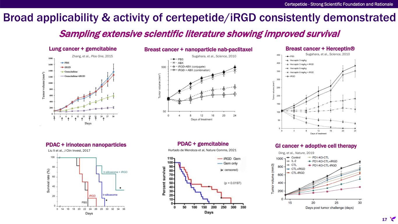 Certepetide/iRGD selectively promotes intratumoral penetration 1 Braun et al., Nature Mater. 2014. 2 Liu, Braun et al., Nature Comm. 2017. 3 Sugahara et al 2010. 16 Certepetide - Strong Scientific Foundation and Rationale Whole body imaging of mice with pancreatic ductal adenocarcinoma (arrow) dosed with Fluorescent Quantum Dots (FQDs) with and without certepetide(1),(2)  Circulating FQDs result in whole body fluorescence  Etching solution quenches fluorescence in circulation tumor FQDs + Etching solution tumor Certepetide + FQDs + Etching solution When co-administered with iRGD, nab- paclitaxel (Abraxane or ABX) is preferentially taken up by tumor tissue in mice(3) FQDs