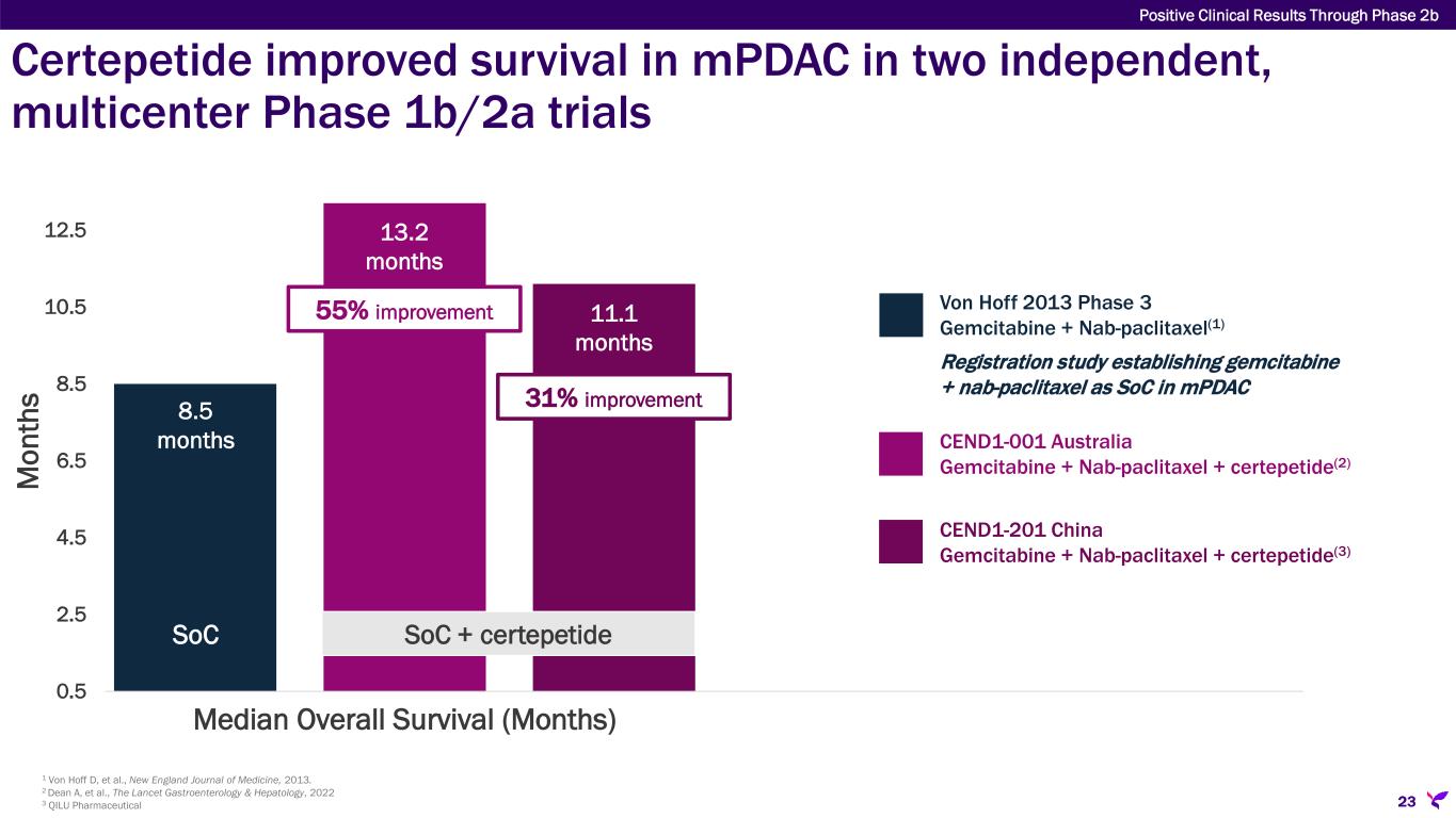 Certepetide demonstrated internal consistency in two Phase 1b/2a trials 1 Von Hoff D, et al., New England Journal of Medicine, 2013. 2 Dean A, et al., The Lancet Gastroenterology & Hepatology, 2022 3 QILU Pharmaceutical 24 Complete Response Partial Response Objective Response Rate Disease Control Rate (16 weeks) CA19-9 Drop >20% Median PFS 23% 59% 23% 3.4% 0.1% 55% 79% 96% 0% 42% 48% 61% 87% 91% SoC SoC SoC SoCSoC 5.5 mo 9.7 mo 5.8 mo 42% CEND1-201 China Gemcitabine + Nab-paclitaxel + certepetide(3) Von Hoff 2013 Phase 3 Gemcitabine + Nab-paclitaxel(1) Registration study establishing gemcitabine + nab-paclitaxel as SoC in mPDAC CEND1-001 Australia Gemcitabine + Nab-paclitaxel + certepetide(2) Positive Clinical Results Through Phase 2b