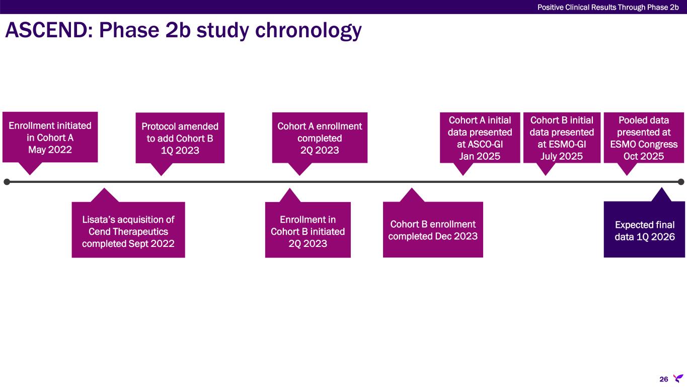 ASCEND: Phase 2b study of certepetide in mPDAC  Sponsor: Australasian Gastro-Intestinal Trials Group (AGITG) and NHMRC Clinical Trials Centre of University of Sydney (Australia) • Lisata-funded, data contractually sponsor- controlled • Restricts initial public announcement of results to scientific meetings or publications  ‘Academic design’ overlooked global regulatory standards supporting eventual approval • Powered for 6-mos. PFS primary endpoint • Not a standard regulatory endpoint • Single cohort with one IV push of certepetide 3.2 mg/kg + SoC vs. SoC alone Investigator initiated trial inherited through acquisition of Cend Therapeutics Lisata amended protocol to ensure trial data will support global registration strategy  Lisata clinical trial data rights defined/expanded  ‘Product development design’ considers eventual regulatory review and approval  Median overall survival (precedent registration endpoint) added for both cohorts  Second cohort (Cohort B) added with two IV pushes of certepetide 3.2 mg/kg administered 4 hours apart to further evaluate pharmacodynamics of certepetide consistent with FDA Project Optimus 25 Positive Clinical Results Through Phase 2b