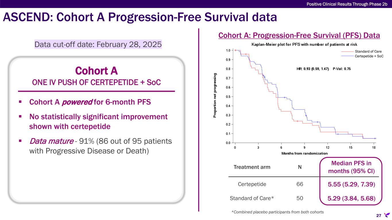 ASCEND: Phase 2b study chronology 26 Positive Clinical Results Through Phase 2b Enrollment initiated in Cohort A May 2022 Lisata’s acquisition of Cend Therapeutics completed Sept 2022 Protocol amended to add Cohort B 1Q 2023 Enrollment in Cohort B initiated 2Q 2023 Cohort A enrollment completed 2Q 2023 Expected final data 1Q 2026 Cohort B enrollment completed Dec 2023 Cohort A initial data presented at ASCO-GI Jan 2025 Cohort B initial data presented at ESMO-GI July 2025 Pooled data presented at ESMO Congress Oct 2025