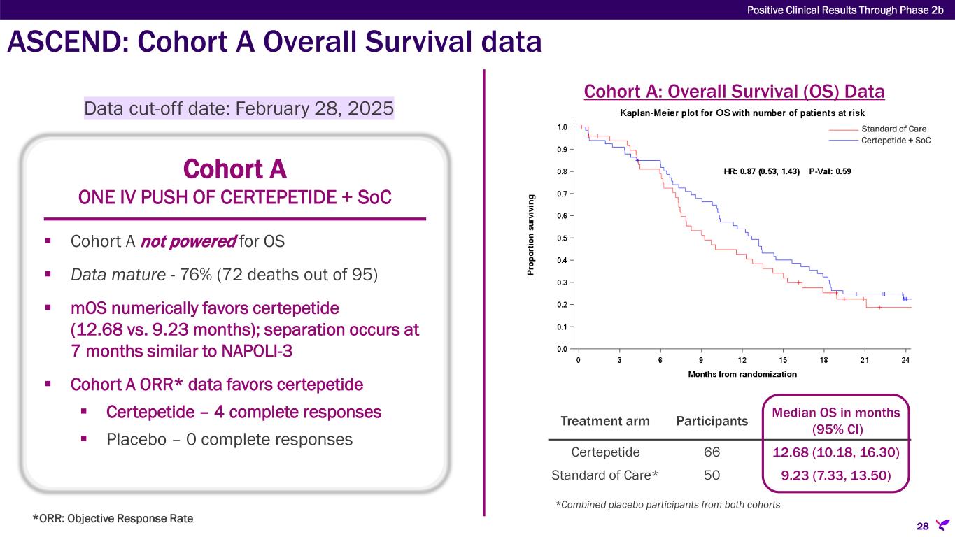 ASCEND: Cohort A Progression-Free Survival data Cohort A ONE IV PUSH OF CERTEPETIDE + SoC  Cohort A powered for 6-month PFS  No statistically significant improvement shown with certepetide  Data mature - 91% (86 out of 95 patients with Progressive Disease or Death) Cohort A: Progression-Free Survival (PFS) Data Treatment arm N Median PFS in months (95% CI) Certepetide 66 5.55 (5.29, 7.39) Standard of Care* 50 5.29 (3.84, 5.68) 27 Data cut-off date: February 28, 2025 Positive Clinical Results Through Phase 2b *Combined placebo participants from both cohorts Certepetide + SoC Standard of Care