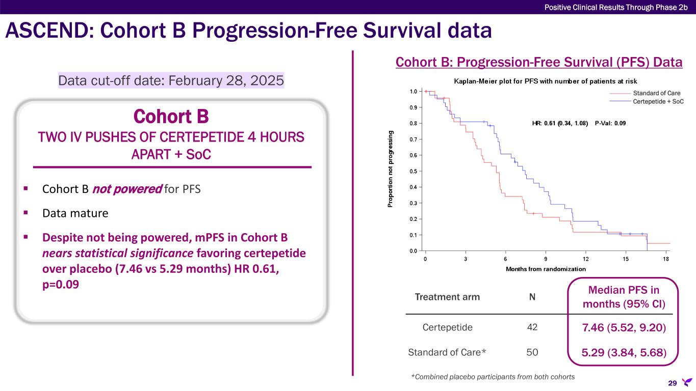 ASCEND: Cohort A Overall Survival data Cohort A ONE IV PUSH OF CERTEPETIDE + SoC  Cohort A not powered for OS  Data mature - 76% (72 deaths out of 95)  mOS numerically favors certepetide (12.68 vs. 9.23 months); separation occurs at 7 months similar to NAPOLI-3  Cohort A ORR* data favors certepetide  Certepetide – 4 complete responses  Placebo – 0 complete responses Cohort A: Overall Survival (OS) Data Treatment arm Participants Median OS in months (95% CI) Certepetide 66 12.68 (10.18, 16.30) Standard of Care* 50 9.23 (7.33, 13.50) *ORR: Objective Response Rate Positive Clinical Results Through Phase 2b 28 Data cut-off date: February 28, 2025 *Combined placebo participants from both cohorts Certepetide + SoC Standard of Care