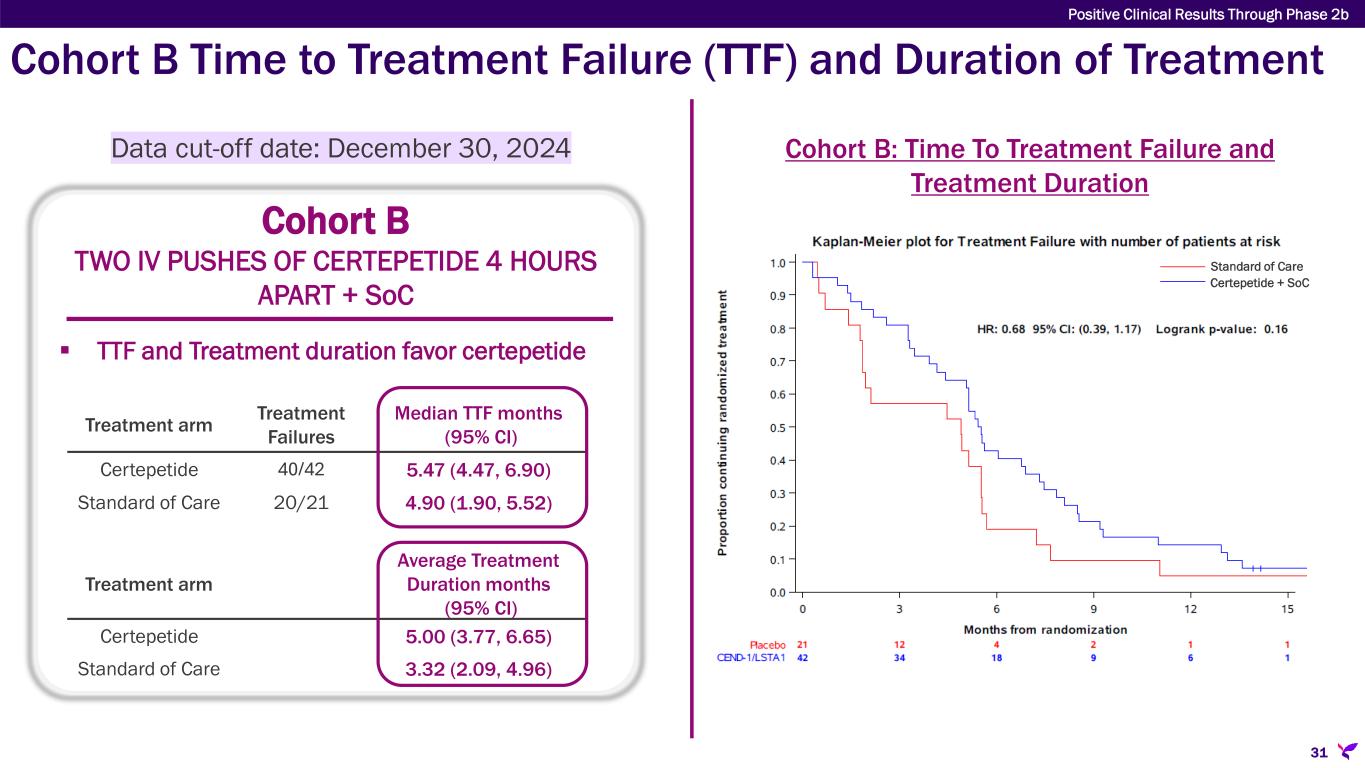ASCEND: Cohort B Overall Survival data Cohort B TWO IV PUSHES OF CERTEPETIDE 4 HOURS APART + SoC  Cohort B not powered for OS  Data mature - 71% (45 deaths out of 63)  mOS favors certepetide (10.32 vs. 9.23 months)  Separation occurs at 7 months similar to NAPOLI-3 NALIRIFOX Phase 3 study data  Cohort B ORR favors certepetide (see next slide)  (CR + PR) 45% vs 19% certepetide vs placebo; 1 CR certepetide, 0 CR placebo group Cohort B: Overall Survival (OS) Data Treatment arm Participants Median OS in months (95% CI) Certepetide 42 10.32 (8.87, 13.14) Standard of Care* 50 9.23 (7.33, 13.50) Positive Clinical Results Through Phase 2b 30 Data cut-off date: February 28, 2025 *Combined placebo participants from both cohorts Certepetide + SoC Standard of Care
