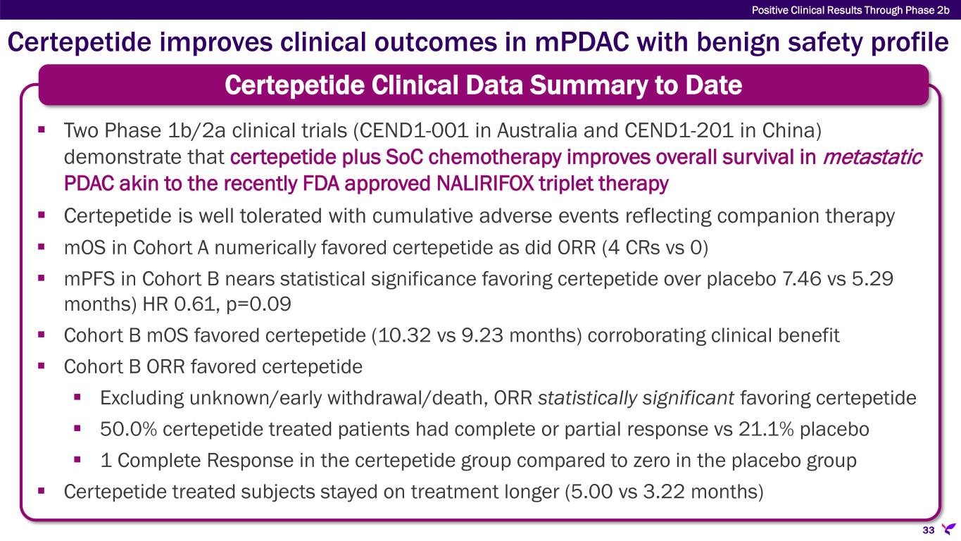 Certepetide improves clinical outcomes in mPDAC with benign safety profile Certepetide Clinical Data Summary to Date 33 Positive Clinical Results Through Phase 2b  Two Phase 1b/2a clinical trials (CEND1-001 in Australia and CEND1-201 in China) demonstrate that certepetide plus SoC chemotherapy improves overall survival in metastatic PDAC akin to the recently FDA approved NALIRIFOX triplet therapy  Certepetide is well tolerated with cumulative adverse events reflecting companion therapy  mOS in Cohort A numerically favored certepetide as did ORR (4 CRs vs 0)  mPFS in Cohort B nears statistical significance favoring certepetide over placebo 7.46 vs 5.29 months) HR 0.61, p=0.09  Cohort B mOS favored certepetide (10.32 vs 9.23 months) corroborating clinical benefit  Cohort B ORR favored certepetide  Excluding unknown/early withdrawal/death, ORR statistically significant favoring certepetide  50.0% certepetide treated patients had complete or partial response vs 21.1% placebo  1 Complete Response in the certepetide group compared to zero in the placebo group  Certepetide treated subjects stayed on treatment longer (5.00 vs 3.22 months)