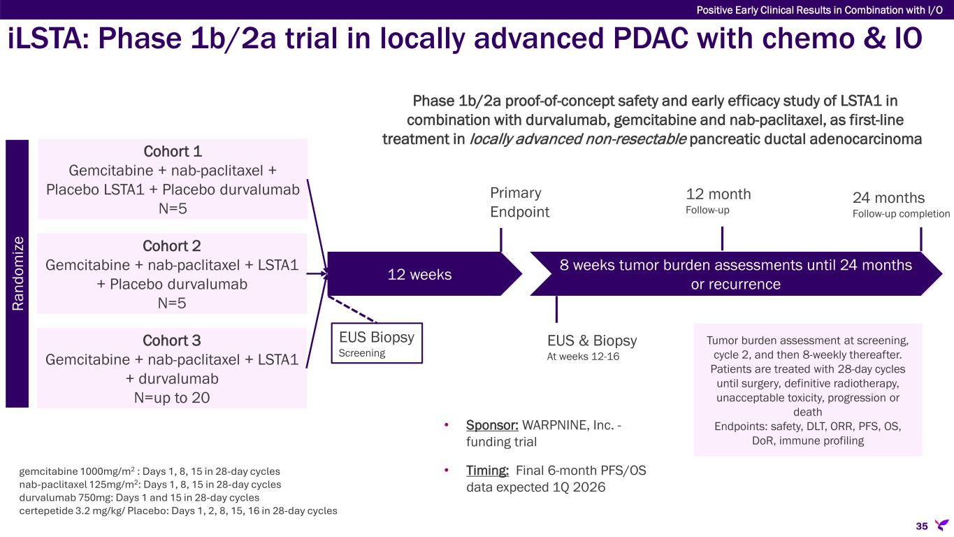 Cohort 2 Gemcitabine + nab-paclitaxel + LSTA1 + Placebo durvalumab N=5 Cohort 1 Gemcitabine + nab-paclitaxel + Placebo LSTA1 + Placebo durvalumab N=5 Cohort 3 Gemcitabine + nab-paclitaxel + LSTA1 + durvalumab N=up to 20 12 weeks 8 weeks tumor burden assessments until 24 months or recurrence 12 month Follow-up Primary Endpoint 24 months Follow-up completion EUS Biopsy Screening EUS & Biopsy At weeks 12-16 Tumor burden assessment at screening, cycle 2, and then 8-weekly thereafter. Patients are treated with 28-day cycles until surgery, definitive radiotherapy, unacceptable toxicity, progression or death Endpoints: safety, DLT, ORR, PFS, OS, DoR, immune profiling Ra nd om iz e Phase 1b/2a proof-of-concept safety and early efficacy study of LSTA1 in combination with durvalumab, gemcitabine and nab-paclitaxel, as first-line treatment in locally advanced non-resectable pancreatic ductal adenocarcinoma • Sponsor: WARPNINE, Inc. - funding trial • Timing: Final 6-month PFS/OS data expected 1Q 2026 35 iLSTA: Phase 1b/2a trial in locally advanced PDAC with chemo & IO gemcitabine 1000mg/m2 : Days 1, 8, 15 in 28-day cycles nab-paclitaxel 125mg/m2: Days 1, 8, 15 in 28-day cycles durvalumab 750mg: Days 1 and 15 in 28-day cycles certepetide 3.2 mg/kg/ Placebo: Days 1, 2, 8, 15, 16 in 28-day cycles Positive Early Clinical Results in Combination with I/O