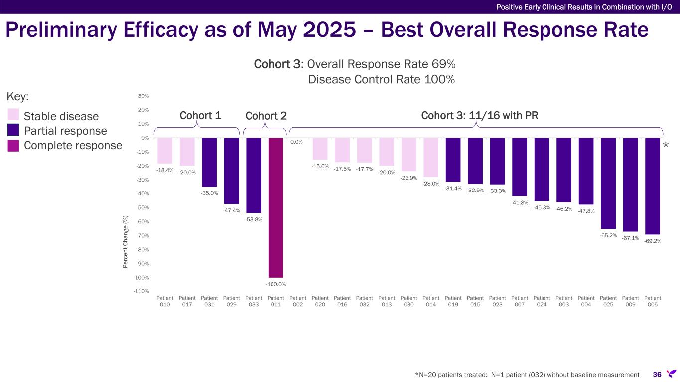 -18.4% -20.0% -35.0% -47.4% -53.8% -100.0% 0.0% -15.6% -17.5% -17.7% -20.0% -23.9% -28.0% -31.4% -32.9% -33.3% -41.8% -45.3% -46.2% -47.8% -65.2% -67.1% -69.2% -110% -100% -90% -80% -70% -60% -50% -40% -30% -20% -10% 0% 10% 20% 30% Patient 010 Patient 017 Patient 031 Patient 029 Patient 033 Patient 011 Patient 002 Patient 020 Patient 016 Patient 032 Patient 013 Patient 030 Patient 014 Patient 019 Patient 015 Patient 023 Patient 007 Patient 024 Patient 003 Patient 004 Patient 025 Patient 009 Patient 005 Preliminary Efficacy as of May 2025 – Best Overall Response Rate *N=20 patients treated: N=1 patient (032) without baseline measurement Cohort 3: 11/16 with PR Key: Stable disease Partial response Complete response Cohort 1 Cohort 2 * Cohort 3: Overall Response Rate 69% Disease Control Rate 100% Pe rc en t C ha ng e (% ) Positive Early Clinical Results in Combination with I/O 36