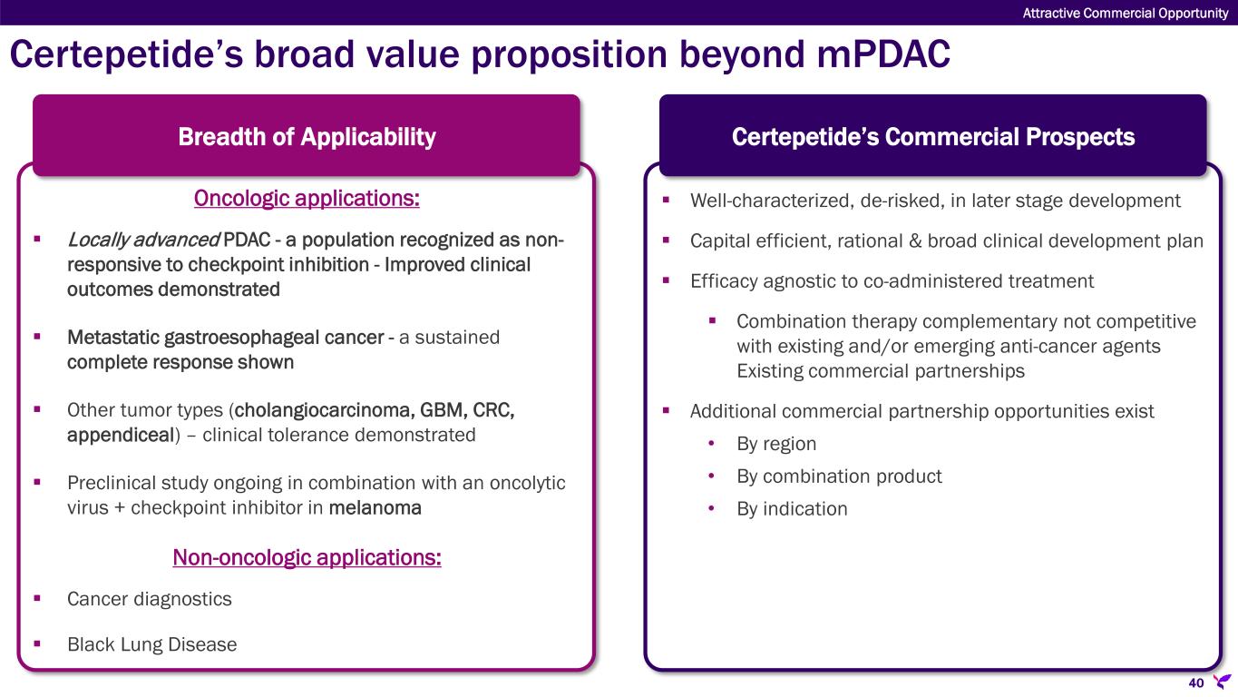 Patient with mPDAC Diagnosis Poor Patient Functional Status Good Patient Functional Status Gemcitabine + Nab-paclitaxel Gemcitabine + Nab-paclitaxel First-Line (1L) First-Line (1L) Disease Progression FOLFIRINOX or NALIRIFOX FOLFIRINOX or FOLFIRI or FOLFOX or NALIRIFOX Second-Line (2L) Second-Line (2L) Immunotherapy or other treatment CERTEPETIDE CERTEPETIDE Immunotherapy or other treatment CERTEPETIDE Third-Line (3L) Third-Line (3L) Certepetide can be used throughout the mPDAC treatment paradigm Attractive Commercial Opportunity Disease Progression 39