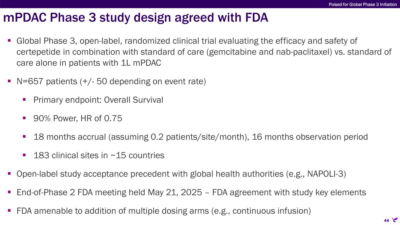 Requisite clinical development steps completed in preparation for Phase 3 trial Full NDA-ready preclinical toxicology package Phase 1 dose ranging study in 1L mPDAC  No DLTs observed; safety profile consistent with co-administered SoC  Certepetide improved all efficacy endpoints compared to SoC Second independent Phase 1 study in in 1L mPDAC in different geography  Improvement in mOS effect corroborated FDA end-of-Phase 1 meeting completed: agreement on tox package, comparator, endpoints, and patient population for NDA Large Phase 2b (ASCEND) study in 1L mPDAC completed  Effect size for Phase 3 estimated FDA end-of-Phase 2 meeting held; agreement reached on Phase 3 program and development plan Clinical operations and CMC readiness for Phase 3 underway Poised for Global Phase 3 Initiation 43