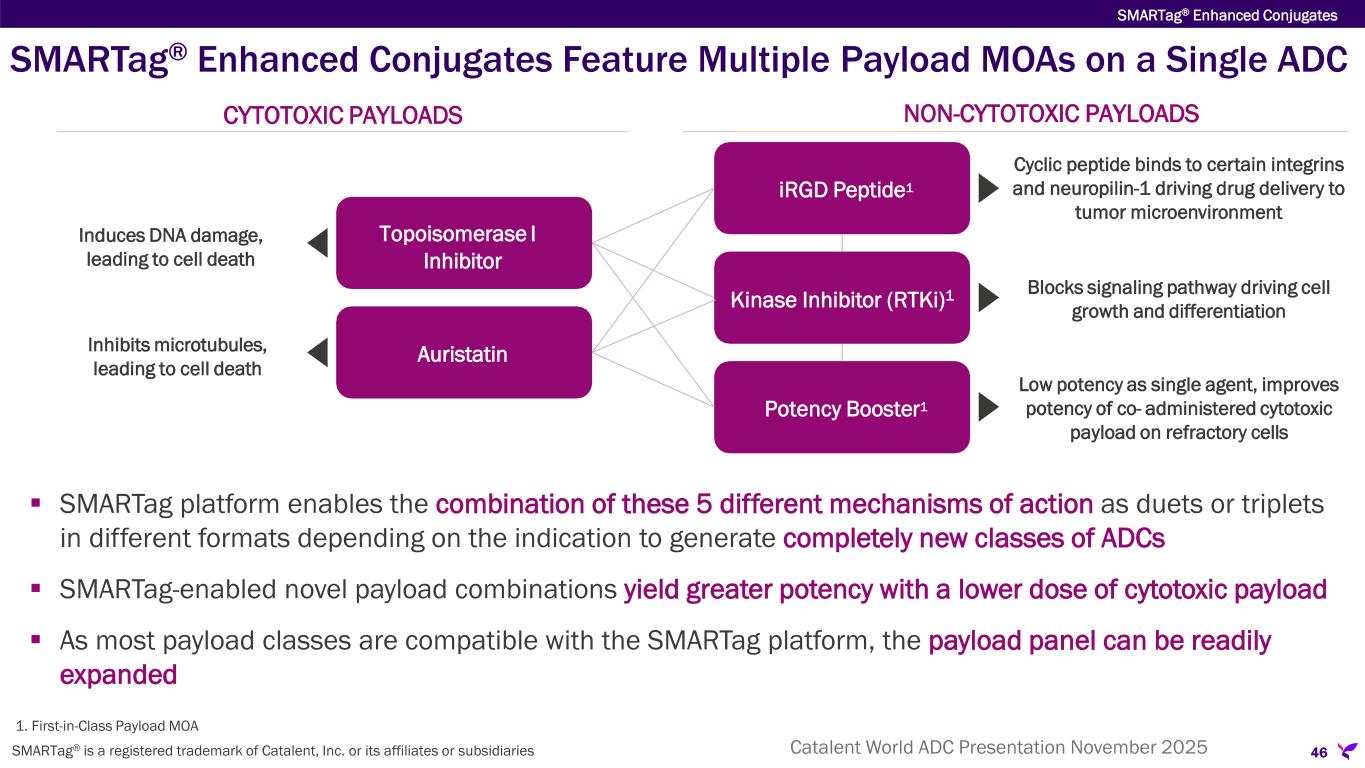 SMARTag® Enhanced Conjugates Feature Multiple Payload MOAs on a Single ADC  SMARTag platform enables the combination of these 5 different mechanisms of action as duets or triplets in different formats depending on the indication to generate completely new classes of ADCs  SMARTag-enabled novel payload combinations yield greater potency with a lower dose of cytotoxic payload  As most payload classes are compatible with the SMARTag platform, the payload panel can be readily expanded CYTOTOXIC PAYLOADS NON-CYTOTOXIC PAYLOADS Cyclic peptide binds to certain integrins and neuropilin-1 driving drug delivery to tumor microenvironment iRGD Peptide1 Blocks signaling pathway driving cell growth and differentiationKinase Inhibitor (RTKi)1 Low potency as single agent, improves potency of co- administered cytotoxic payload on refractory cells Potency Booster1 Induces DNA damage, leading to cell death Topoisomerase I Inhibitor Inhibits microtubules, leading to cell death Auristatin 46 SMARTag® Enhanced Conjugates 1. First-in-Class Payload MOA SMARTag® is a registered trademark of Catalent, Inc. or its affiliates or subsidiaries Catalent World ADC Presentation November 2025