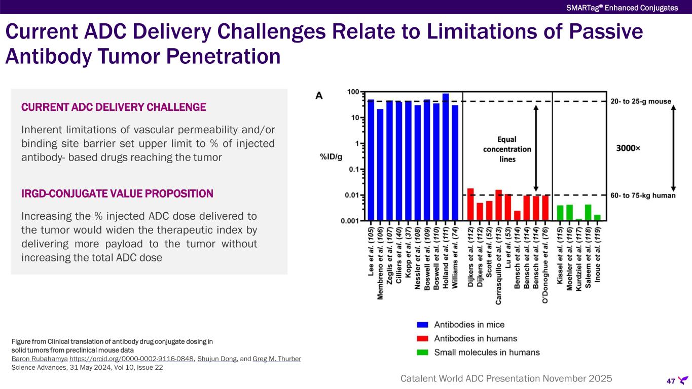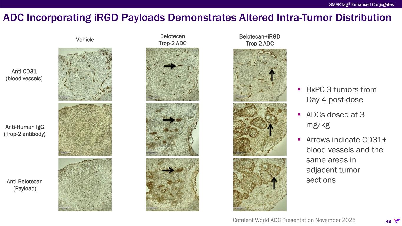 47 CURRENT ADC DELIVERY CHALLENGE Inherent limitations of vascular permeability and/or binding site barrier set upper limit to % of injected antibody- based drugs reaching the tumor IRGD-CONJUGATE VALUE PROPOSITION Increasing the % injected ADC dose delivered to the tumor would widen the therapeutic index by delivering more payload to the tumor without increasing the total ADC dose Figure from Clinical translation of antibody drug conjugate dosing in solid tumors from preclinical mouse data Baron Rubahamya https://orcid.org/0000-0002-9116-0848, Shujun Dong, and Greg M. Thurber Science Advances, 31 May 2024, Vol 10, Issue 22 SMARTag® Enhanced Conjugates Current ADC Delivery Challenges Relate to Limitations of Passive Antibody Tumor Penetration Catalent World ADC Presentation November 2025