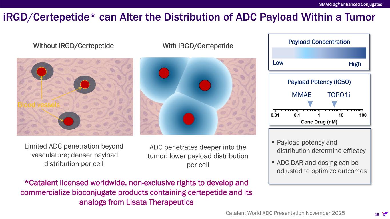 ADC Incorporating iRGD Payloads Demonstrates Altered Intra-Tumor Distribution 48 SMARTag® Enhanced Conjugates Vehicle Anti-Belotecan (Payload) Belotecan+iRGD Trop-2 ADC Belotecan Trop-2 ADC Anti-Human IgG (Trop-2 antibody) Anti-CD31 (blood vessels)  BxPC-3 tumors from Day 4 post-dose  ADCs dosed at 3 mg/kg  Arrows indicate CD31+ blood vessels and the same areas in adjacent tumor sections Catalent World ADC Presentation November 2025