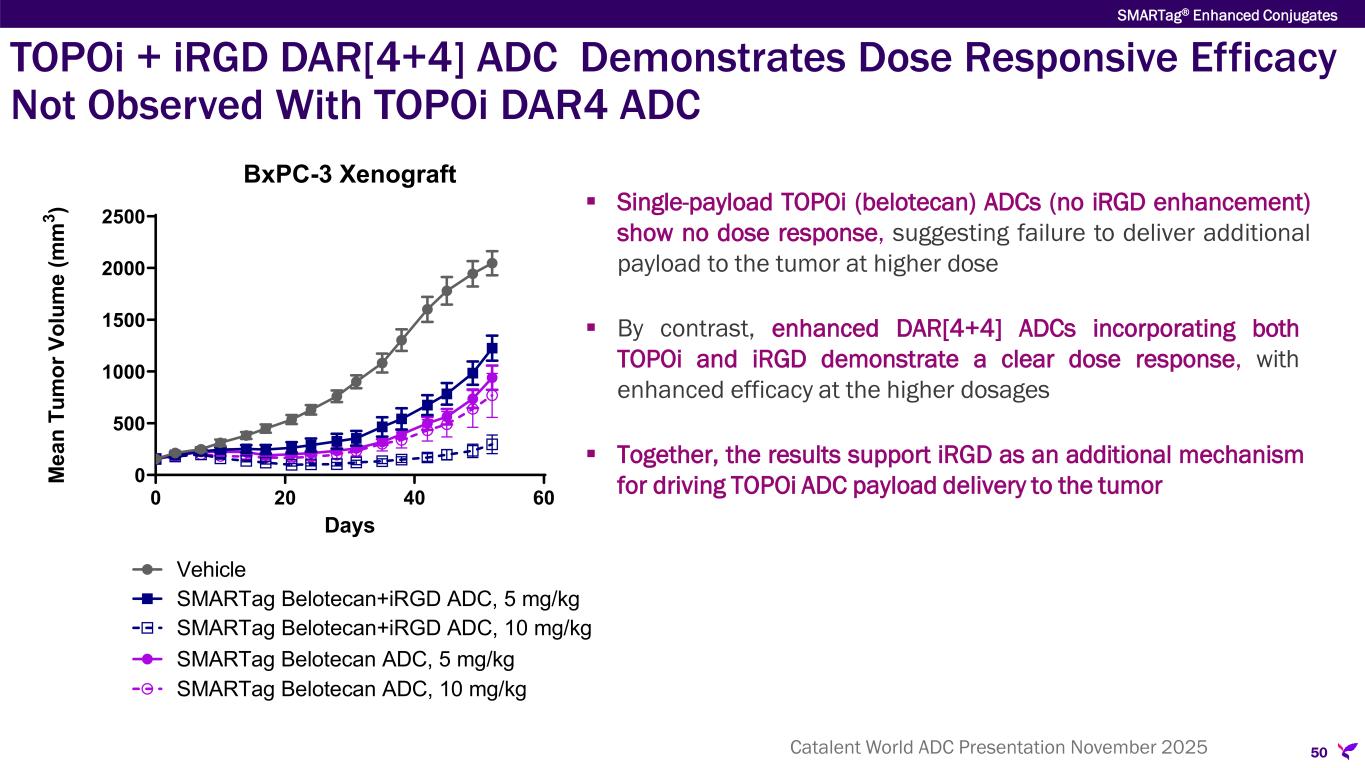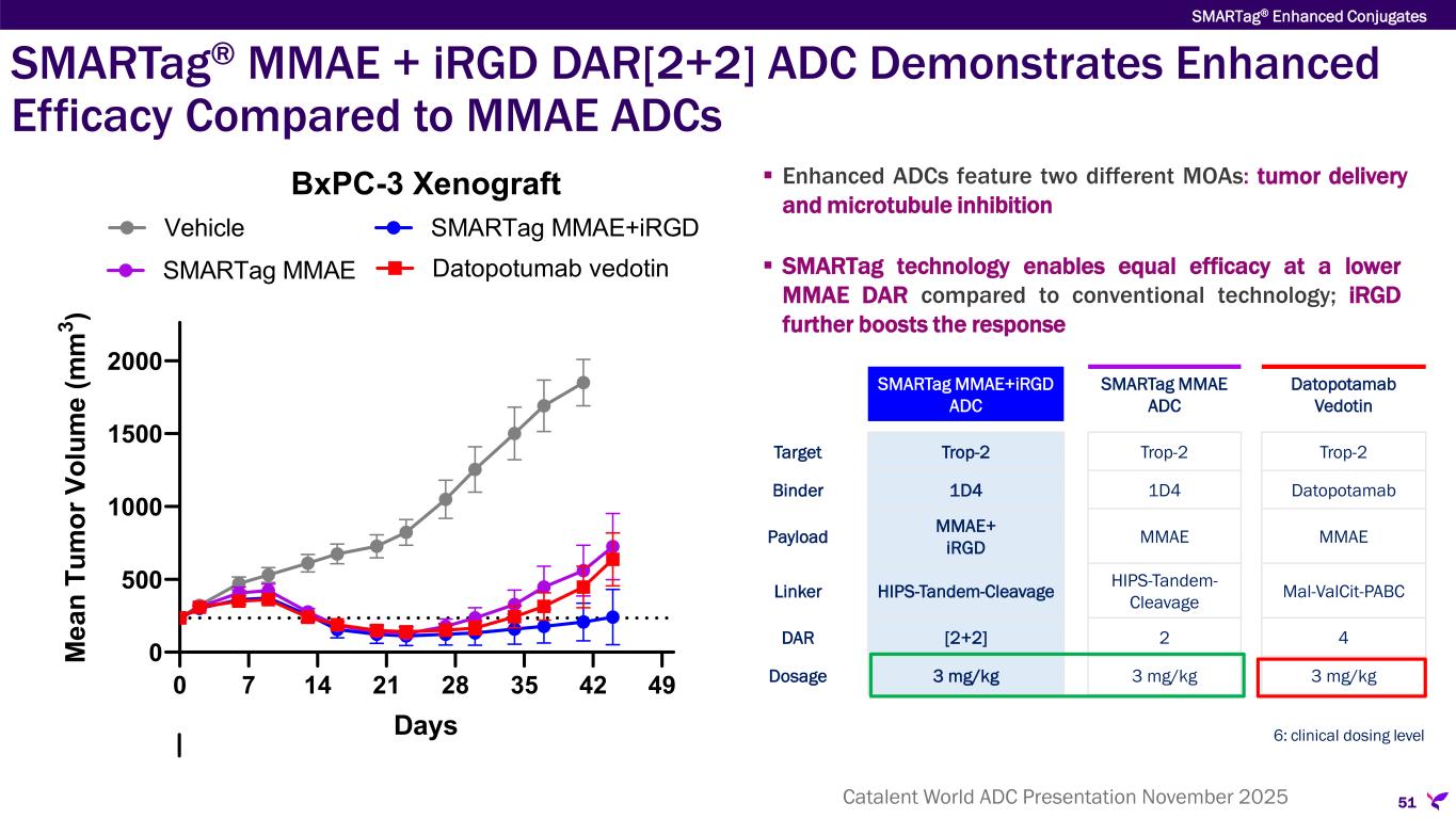 TOPOi + iRGD DAR[4+4] ADC Demonstrates Dose Responsive Efficacy Not Observed With TOPOi DAR4 ADC  Single-payload TOPOi (belotecan) ADCs (no iRGD enhancement) show no dose response, suggesting failure to deliver additional payload to the tumor at higher dose  By contrast, enhanced DAR[4+4] ADCs incorporating both TOPOi and iRGD demonstrate a clear dose response, with enhanced efficacy at the higher dosages  Together, the results support iRGD as an additional mechanism for driving TOPOi ADC payload delivery to the tumor 50 SMARTag® Enhanced Conjugates 0 20 40 60 0 500 1000 1500 2000 2500 Days M ea n Tu m or V ol um e (m m 3 ) BxPC-3 Xenograft Vehicle SMARTag Belotecan+iRGD ADC, 5 mg/kg SMARTag Belotecan+iRGD ADC, 10 mg/kg SMARTag Belotecan ADC, 5 mg/kg SMARTag Belotecan ADC, 10 mg/kg Catalent World ADC Presentation November 2025
