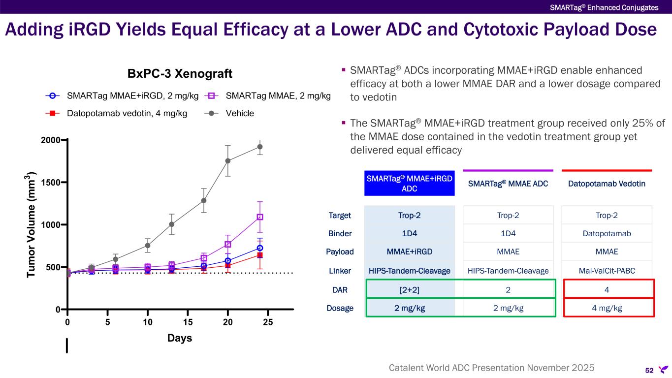 SMARTag® MMAE + iRGD DAR[2+2] ADC Demonstrates Enhanced Efficacy Compared to MMAE ADCs  Enhanced ADCs feature two different MOAs: tumor delivery and microtubule inhibition  SMARTag technology enables equal efficacy at a lower MMAE DAR compared to conventional technology; iRGD further boosts the response 51 6: clinical dosing level SMARTag® Enhanced Conjugates 0 7 14 21 28 35 42 49 0 500 1000 1500 2000 Days M ea n Tu m or V ol um e (m m 3 ) BxPC-3 Xenograft Vehicle SMARTag MMAE+iRGD SMARTag MMAE Datopotumab vedotin SMARTag MMAE+iRGD ADC SMARTag MMAE ADC Datopotamab Vedotin Target Trop-2 Trop-2 Trop-2 Binder 1D4 1D4 Datopotamab Payload MMAE+ iRGD MMAE MMAE Linker HIPS-Tandem-Cleavage HIPS-Tandem- Cleavage Mal-ValCit-PABC DAR [2+2] 2 4 Dosage 3 mg/kg 3 mg/kg 3 mg/kg Catalent World ADC Presentation November 2025