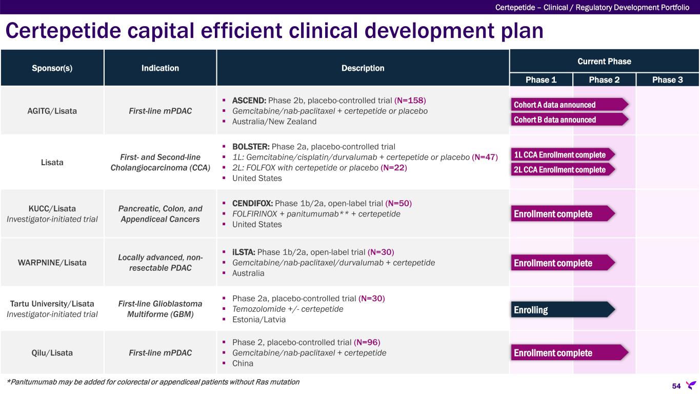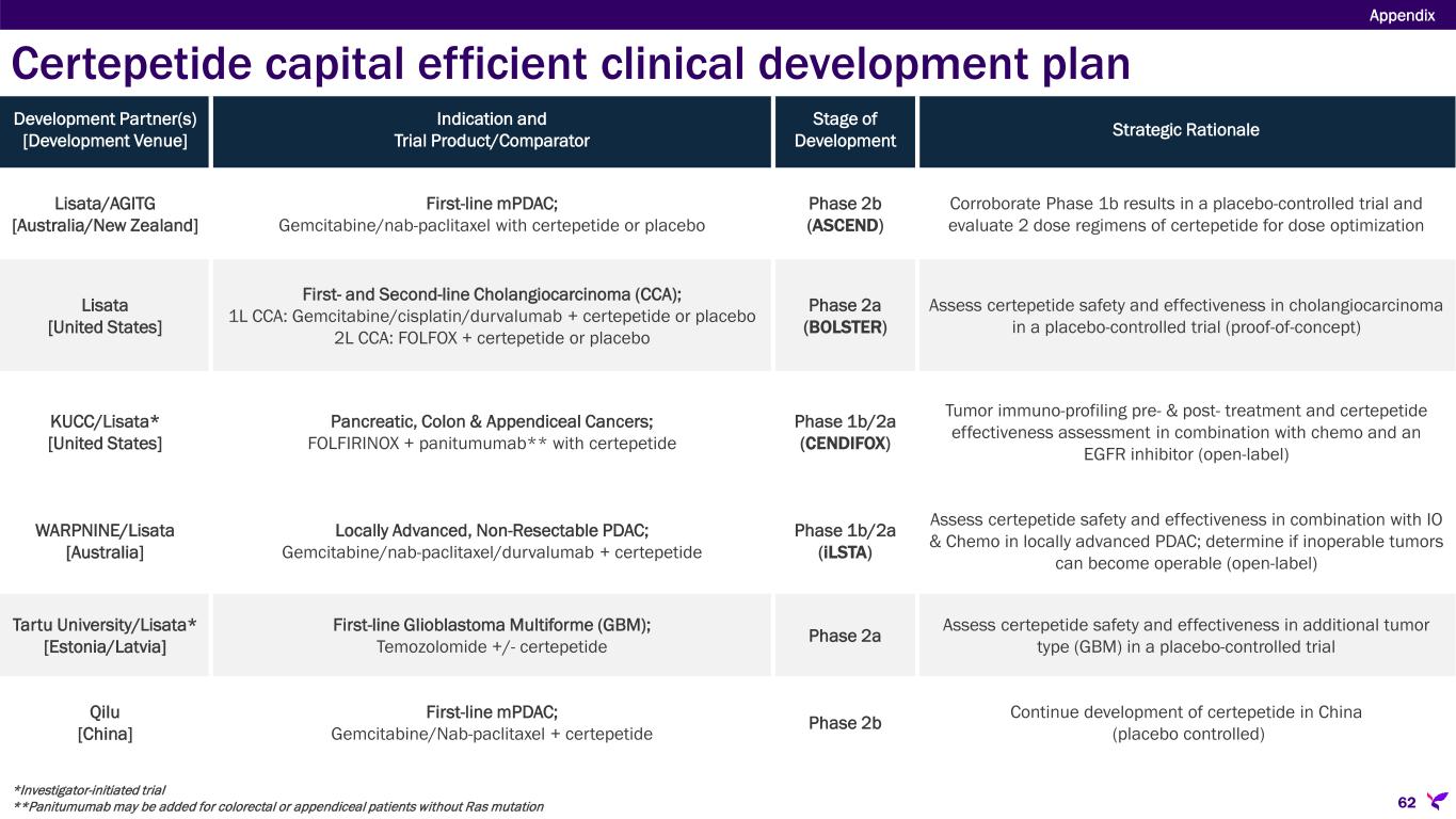Appendix Certepetide capital efficient clinical development plan Development Partner(s) [Development Venue] Indication and Trial Product/Comparator Stage of Development Strategic Rationale Lisata/AGITG [Australia/New Zealand] First-line mPDAC; Gemcitabine/nab-paclitaxel with certepetide or placebo Phase 2b (ASCEND) Corroborate Phase 1b results in a placebo-controlled trial and evaluate 2 dose regimens of certepetide for dose optimization Lisata [United States] First- and Second-line Cholangiocarcinoma (CCA); 1L CCA: Gemcitabine/cisplatin/durvalumab + certepetide or placebo 2L CCA: FOLFOX + certepetide or placebo Phase 2a (BOLSTER) Assess certepetide safety and effectiveness in cholangiocarcinoma in a placebo-controlled trial (proof-of-concept) KUCC/Lisata* [United States] Pancreatic, Colon & Appendiceal Cancers; FOLFIRINOX + panitumumab** with certepetide Phase 1b/2a (CENDIFOX) Tumor immuno-profiling pre- & post- treatment and certepetide effectiveness assessment in combination with chemo and an EGFR inhibitor (open-label) WARPNINE/Lisata [Australia] Locally Advanced, Non-Resectable PDAC; Gemcitabine/nab-paclitaxel/durvalumab + certepetide Phase 1b/2a (iLSTA) Assess certepetide safety and effectiveness in combination with IO & Chemo in locally advanced PDAC; determine if inoperable tumors can become operable (open-label) Tartu University/Lisata* [Estonia/Latvia] First-line Glioblastoma Multiforme (GBM); Temozolomide +/- certepetide Phase 2a Assess certepetide safety and effectiveness in additional tumor type (GBM) in a placebo-controlled trial Qilu [China] First-line mPDAC; Gemcitabine/Nab-paclitaxel + certepetide Phase 2b Continue development of certepetide in China (placebo controlled) *Investigator-initiated trial **Panitumumab may be added for colorectal or appendiceal patients without Ras mutation 62