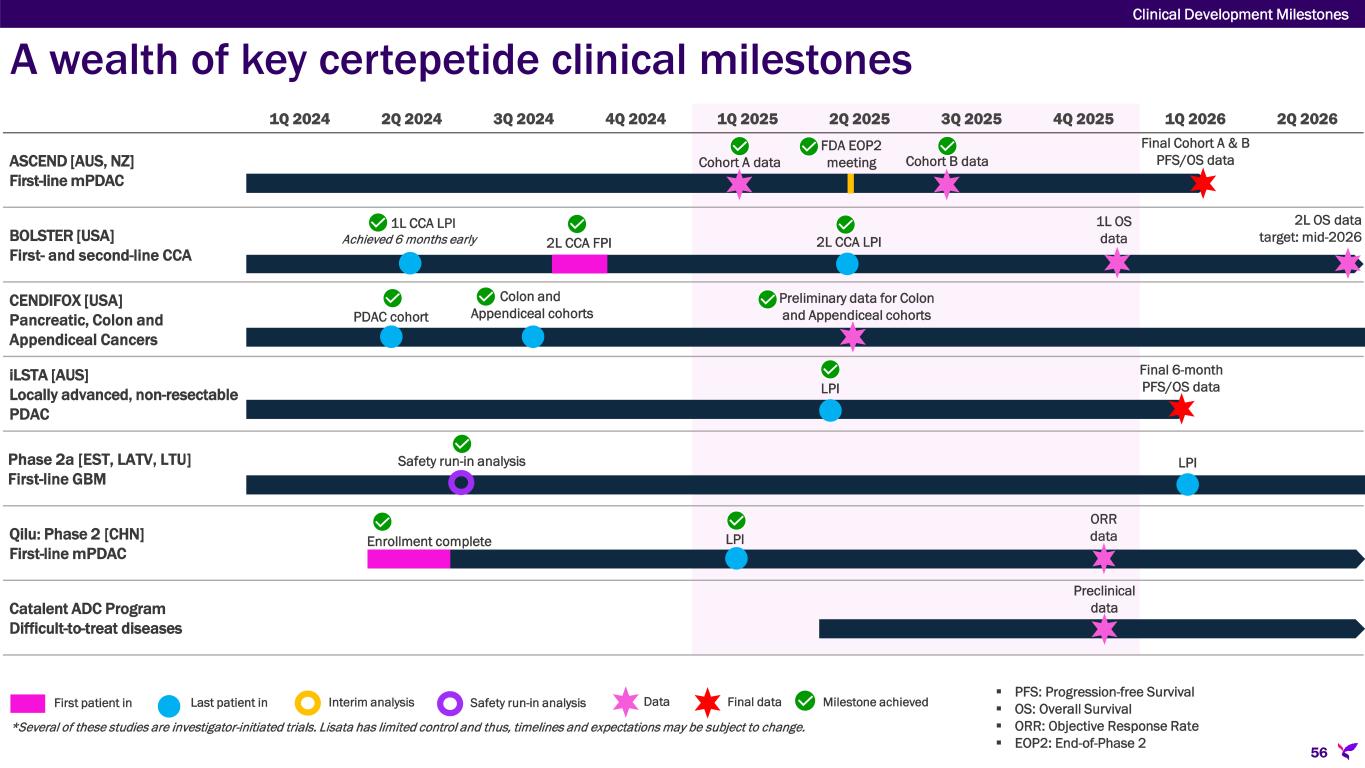 A wealth of key certepetide clinical milestones Clinical Development Milestones 56 1Q 2024 2Q 2024 3Q 2024 4Q 2024 1Q 2025 2Q 2025 3Q 2025 4Q 2025 1Q 2026 2Q 2026 ASCEND [AUS, NZ] First-line mPDAC BOLSTER [USA] First- and second-line CCA CENDIFOX [USA] Pancreatic, Colon and Appendiceal Cancers iLSTA [AUS] Locally advanced, non-resectable PDAC Phase 2a [EST, LATV, LTU] First-line GBM Qilu: Phase 2 [CHN] First-line mPDAC Catalent ADC Program Difficult-to-treat diseases *Several of these studies are investigator-initiated trials. Lisata has limited control and thus, timelines and expectations may be subject to change.  PFS: Progression-free Survival  OS: Overall Survival  ORR: Objective Response Rate  EOP2: End-of-Phase 2 First patient in Last patient in Interim analysis Data Final data Milestone achievedSafety run-in analysis Cohort A data Final Cohort A & B PFS/OS data FDA EOP2 meeting Cohort B data 1L CCA LPI Achieved 6 months early 2L CCA FPI 2L CCA LPI 1L OS data 2L OS data target: mid-2026 PDAC cohort Colon and Appendiceal cohorts Preliminary data for Colon and Appendiceal cohorts LPI Final 6-month PFS/OS data Safety run-in analysis LPI Enrollment complete LPI ORR data Preclinical data