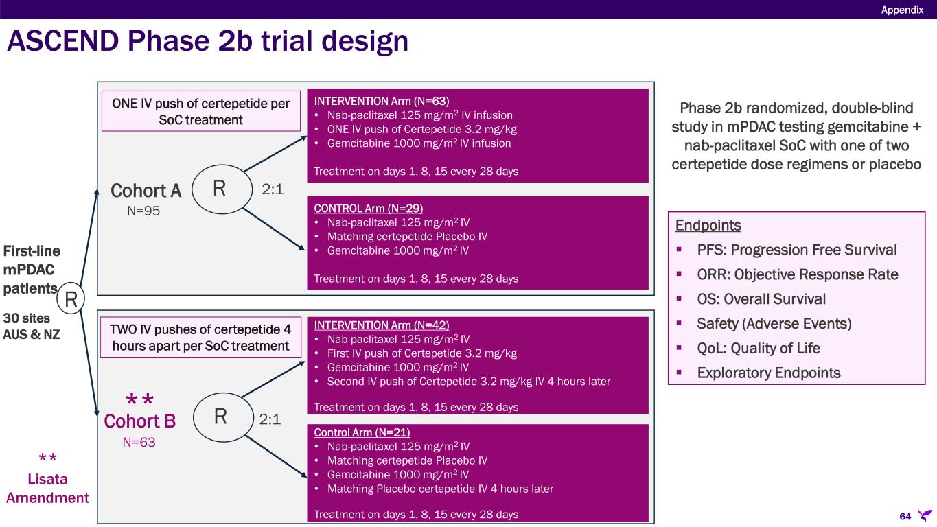 ASCEND: Phase 2b, blinded, randomized trial in mPDAC 63 Appendix Sponsor/Partner  Australasian Gastro-Intestinal Trials Group (AGITG) in collaboration with the NHMRC Clinical Trials Centre at the University of Sydney  Lisata funded (LSTA eligible for ~43% rebate on all qualified R&D expenses in AUS) Objective  Corroborate Phase 1b results in a placebo-controlled study  Determine if a second dose of certepetide further improves patient outcomes Design  Phase 2b randomized, double-blind study in mPDAC testing gemcitabine + nab-paclitaxel SoC with one of two certepetide dose regimens or placebo Study Size  N=158 (~30 sites in Australia and New Zealand) Endpoints  Primary: Progression Free Survival  Secondary: AEs, SAEs, Overall Survival, Objective Tumor Response Rate Timing  Enrollment completed December 2023  Preliminary Cohort A data was presented at ASCO-GI in January 2025  Preliminary Cohort B data was presented at ESMO-GI in July 2025