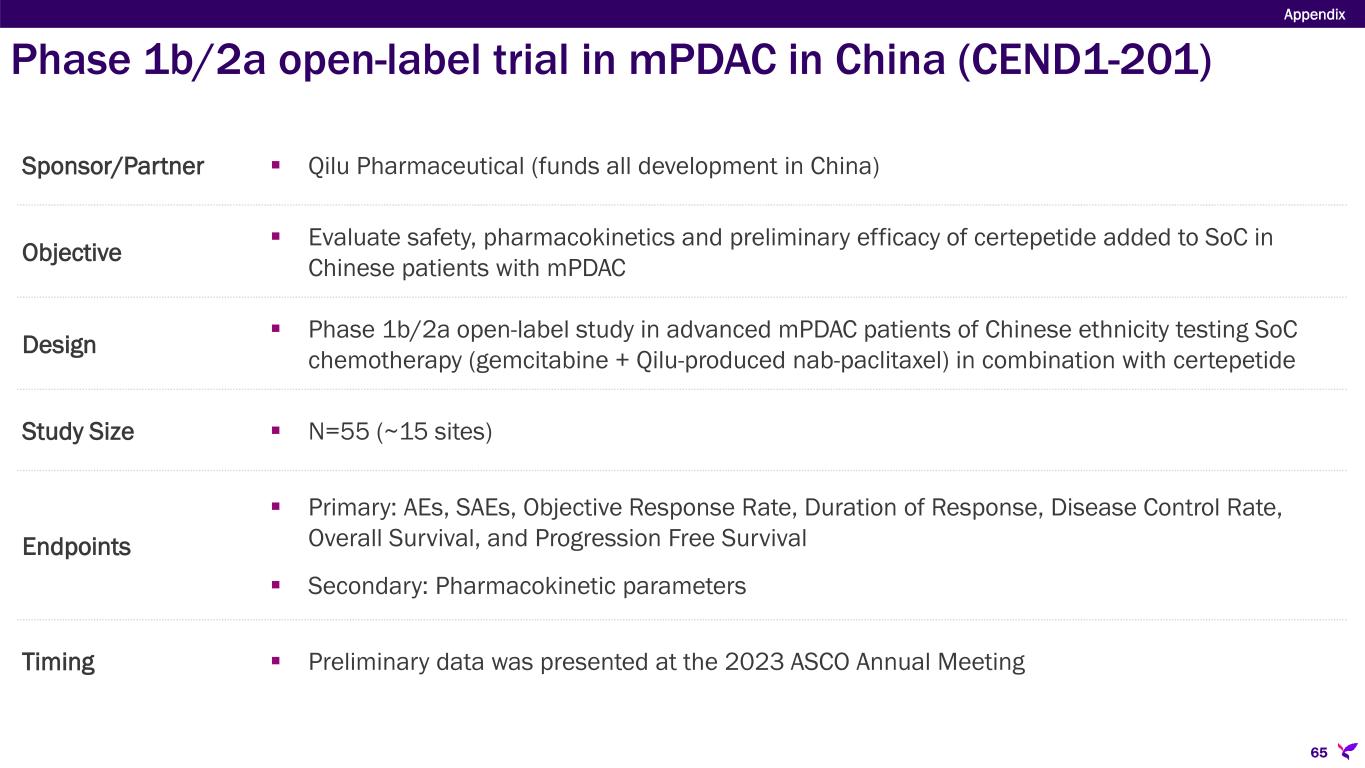 Sponsor/Partner  Qilu Pharmaceutical (funds all development in China) Objective  Evaluate safety, pharmacokinetics and preliminary efficacy of certepetide added to SoC in Chinese patients with mPDAC Design  Phase 1b/2a open-label study in advanced mPDAC patients of Chinese ethnicity testing SoC chemotherapy (gemcitabine + Qilu-produced nab-paclitaxel) in combination with certepetide Study Size  N=55 (~15 sites) Endpoints  Primary: AEs, SAEs, Objective Response Rate, Duration of Response, Disease Control Rate, Overall Survival, and Progression Free Survival  Secondary: Pharmacokinetic parameters Timing  Preliminary data was presented at the 2023 ASCO Annual Meeting Appendix 65 Phase 1b/2a open-label trial in mPDAC in China (CEND1-201)