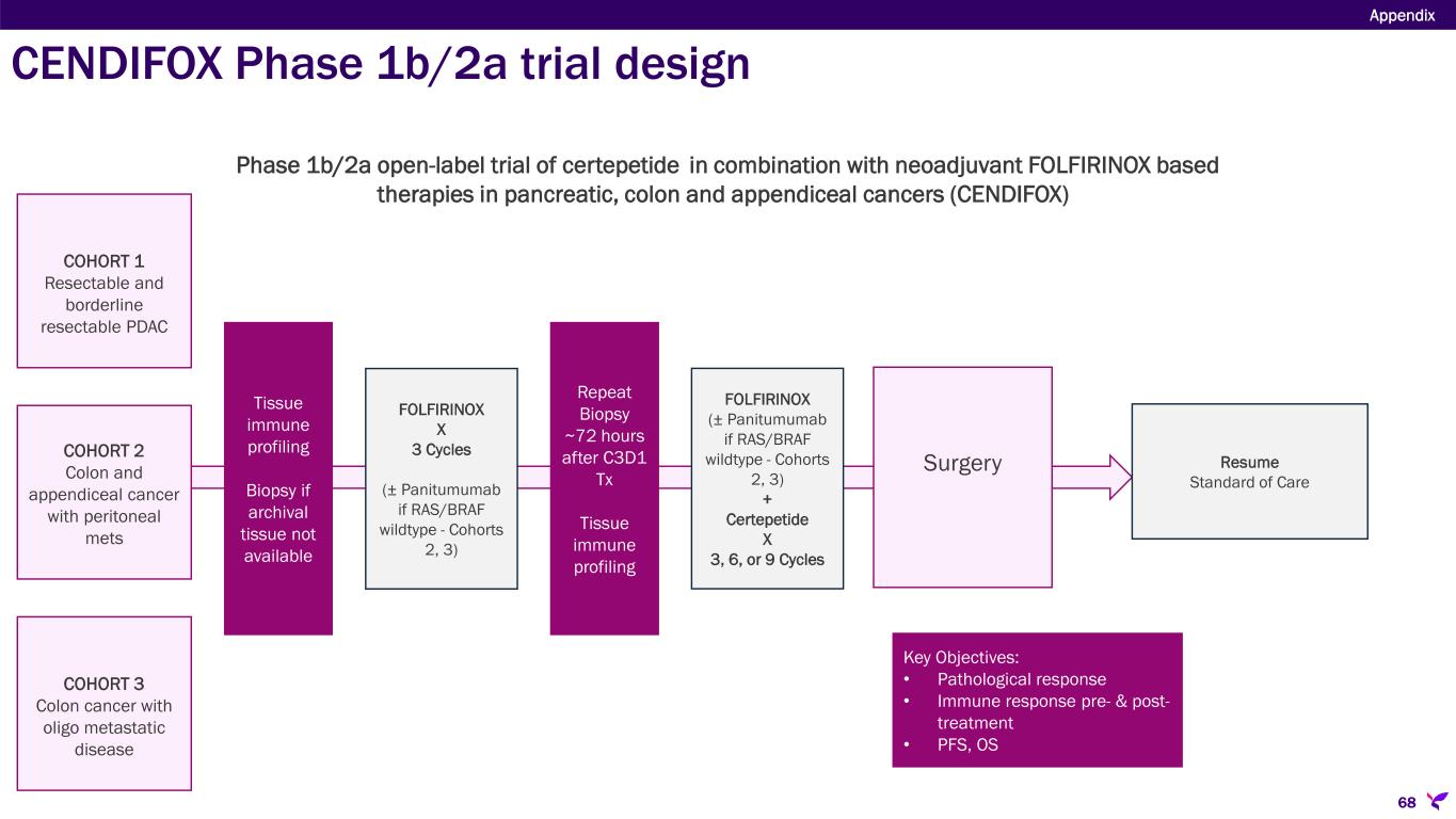 Sponsor/Partner  University of Kansas Medical Center (Investigator initiated trial in U.S.)  KUCC funded; Lisata provides certepetide Objective  Evaluate the safety and therapeutic effect of certepetide in combination with neoadjuvant FOLFIRINOX- based therapies and an EGFR inhibitor for the treatment of pancreatic, colon and appendiceal cancers and determine immuno-profiling in tumor pre- & post- treatment Design  Phase 1b/2a open-label study in resectable pancreatic, colon with oligo metastases and appendiceal with peritoneal metastases cancers testing SoC chemotherapy (neoadjuvant FOLFIRINOX-based therapies) with certepetide ± panitumumab Study Size  N=50 (24 PDAC, 15 colon, and 11 appendiceal) Endpoints  Primary: Drug Safety  Secondary: Overall Survival, Disease-free Survival, Overall Response Rate, RO Resection Rate, Pathological Response Rate Timing  Enrollment completed 4Q24 CENDIFOX: Phase 1b/2a open-label trial in PDAC and other cancers Appendix 67