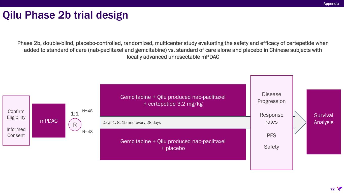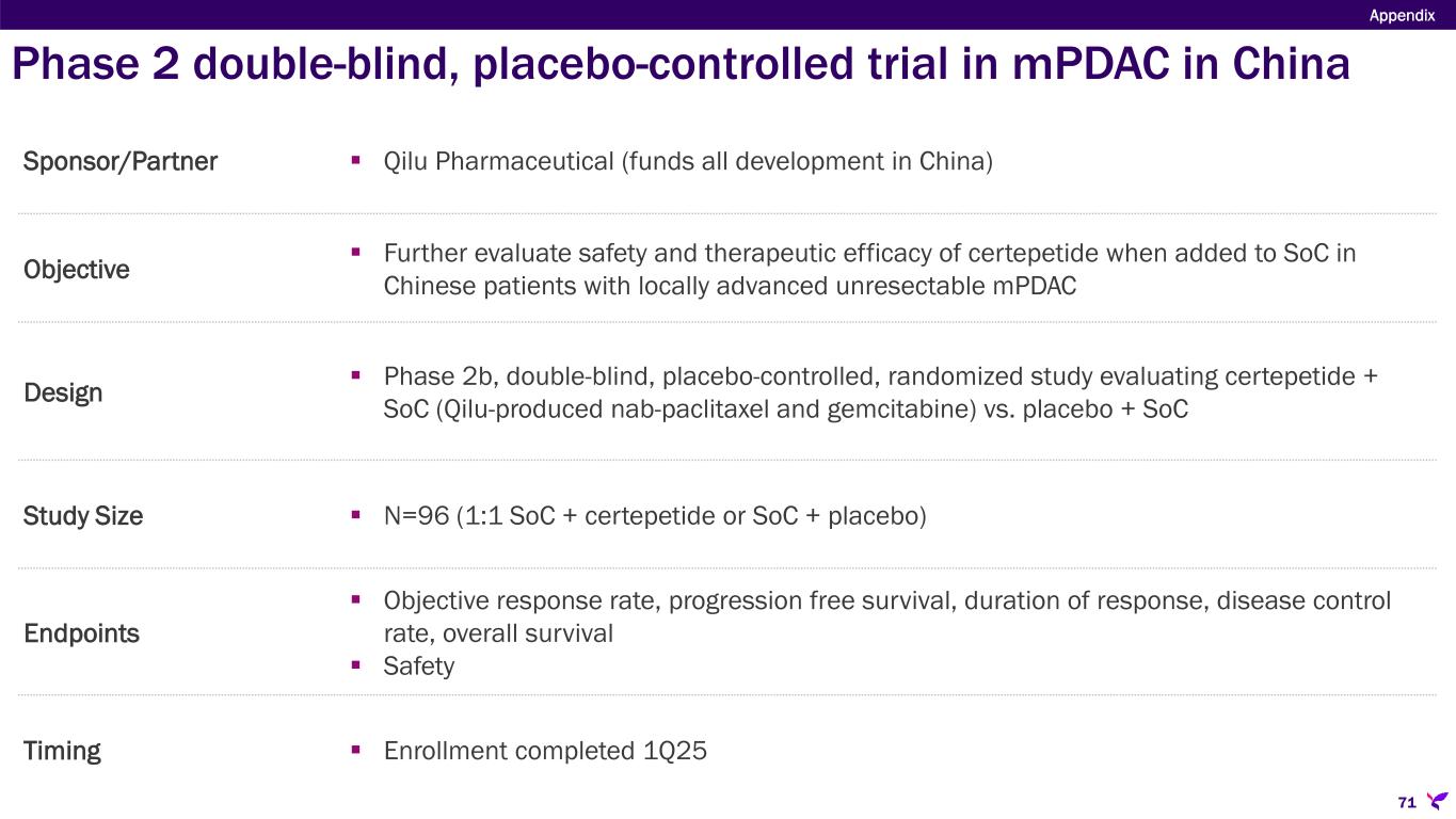 Sponsor/Partner  Qilu Pharmaceutical (funds all development in China) Objective  Further evaluate safety and therapeutic efficacy of certepetide when added to SoC in Chinese patients with locally advanced unresectable mPDAC Design  Phase 2b, double-blind, placebo-controlled, randomized study evaluating certepetide + SoC (Qilu-produced nab-paclitaxel and gemcitabine) vs. placebo + SoC Study Size  N=96 (1:1 SoC + certepetide or SoC + placebo) Endpoints  Objective response rate, progression free survival, duration of response, disease control rate, overall survival  Safety Timing  Enrollment completed 1Q25 Appendix 71 Phase 2 double-blind, placebo-controlled trial in mPDAC in China