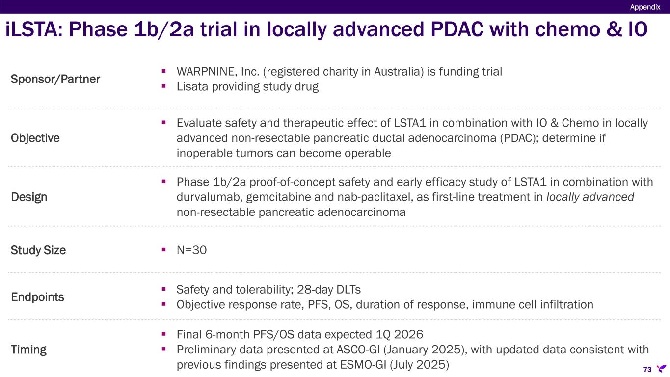 Sponsor/Partner  WARPNINE, Inc. (registered charity in Australia) is funding trial  Lisata providing study drug Objective  Evaluate safety and therapeutic effect of LSTA1 in combination with IO & Chemo in locally advanced non-resectable pancreatic ductal adenocarcinoma (PDAC); determine if inoperable tumors can become operable Design  Phase 1b/2a proof-of-concept safety and early efficacy study of LSTA1 in combination with durvalumab, gemcitabine and nab-paclitaxel, as first-line treatment in locally advanced non-resectable pancreatic adenocarcinoma Study Size  N=30 Endpoints  Safety and tolerability; 28-day DLTs  Objective response rate, PFS, OS, duration of response, immune cell infiltration Timing  Final 6-month PFS/OS data expected 1Q 2026  Preliminary data presented at ASCO-GI (January 2025), with updated data consistent with previous findings presented at ESMO-GI (July 2025) Appendix 73 iLSTA: Phase 1b/2a trial in locally advanced PDAC with chemo & IO