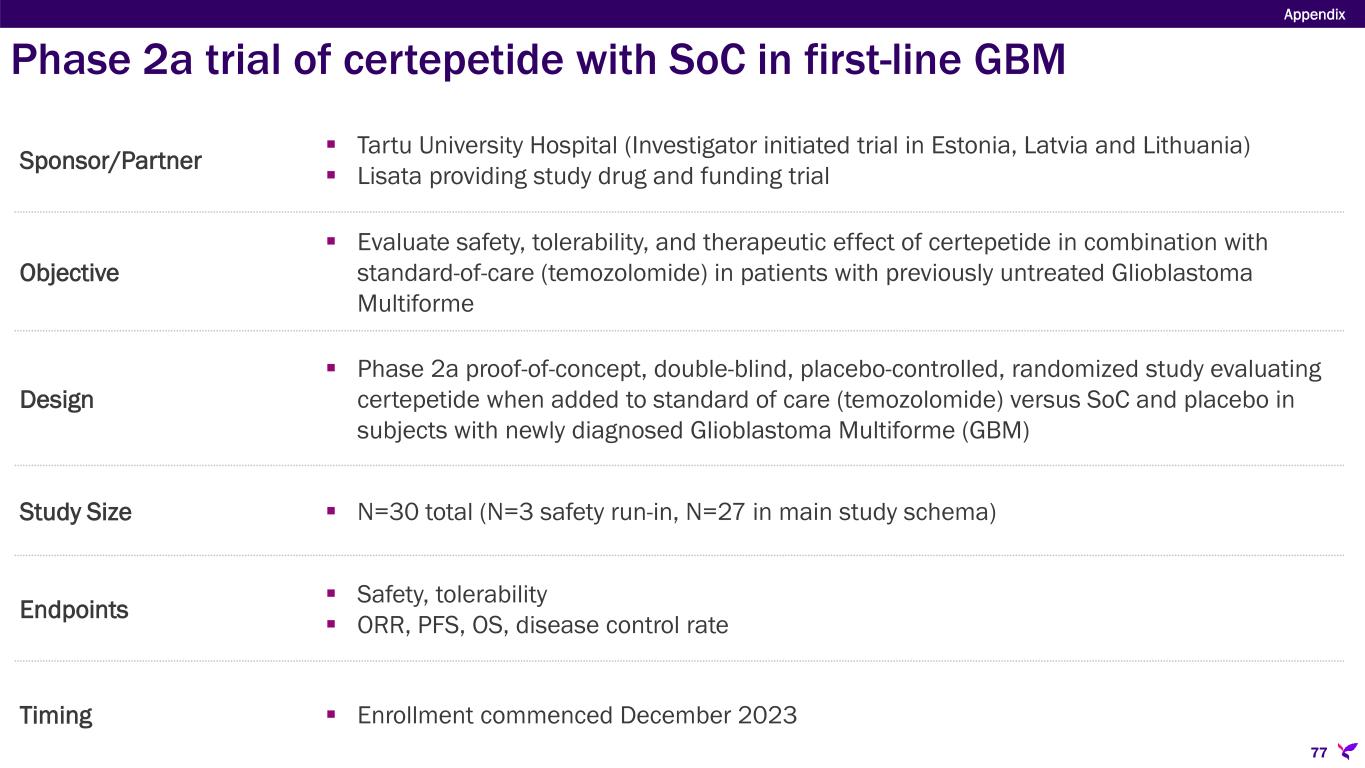 Sponsor/Partner  Tartu University Hospital (Investigator initiated trial in Estonia, Latvia and Lithuania)  Lisata providing study drug and funding trial Objective  Evaluate safety, tolerability, and therapeutic effect of certepetide in combination with standard-of-care (temozolomide) in patients with previously untreated Glioblastoma Multiforme Design  Phase 2a proof-of-concept, double-blind, placebo-controlled, randomized study evaluating certepetide when added to standard of care (temozolomide) versus SoC and placebo in subjects with newly diagnosed Glioblastoma Multiforme (GBM) Study Size  N=30 total (N=3 safety run-in, N=27 in main study schema) Endpoints  Safety, tolerability  ORR, PFS, OS, disease control rate Timing  Enrollment commenced December 2023 Appendix 77 Phase 2a trial of certepetide with SoC in first-line GBM