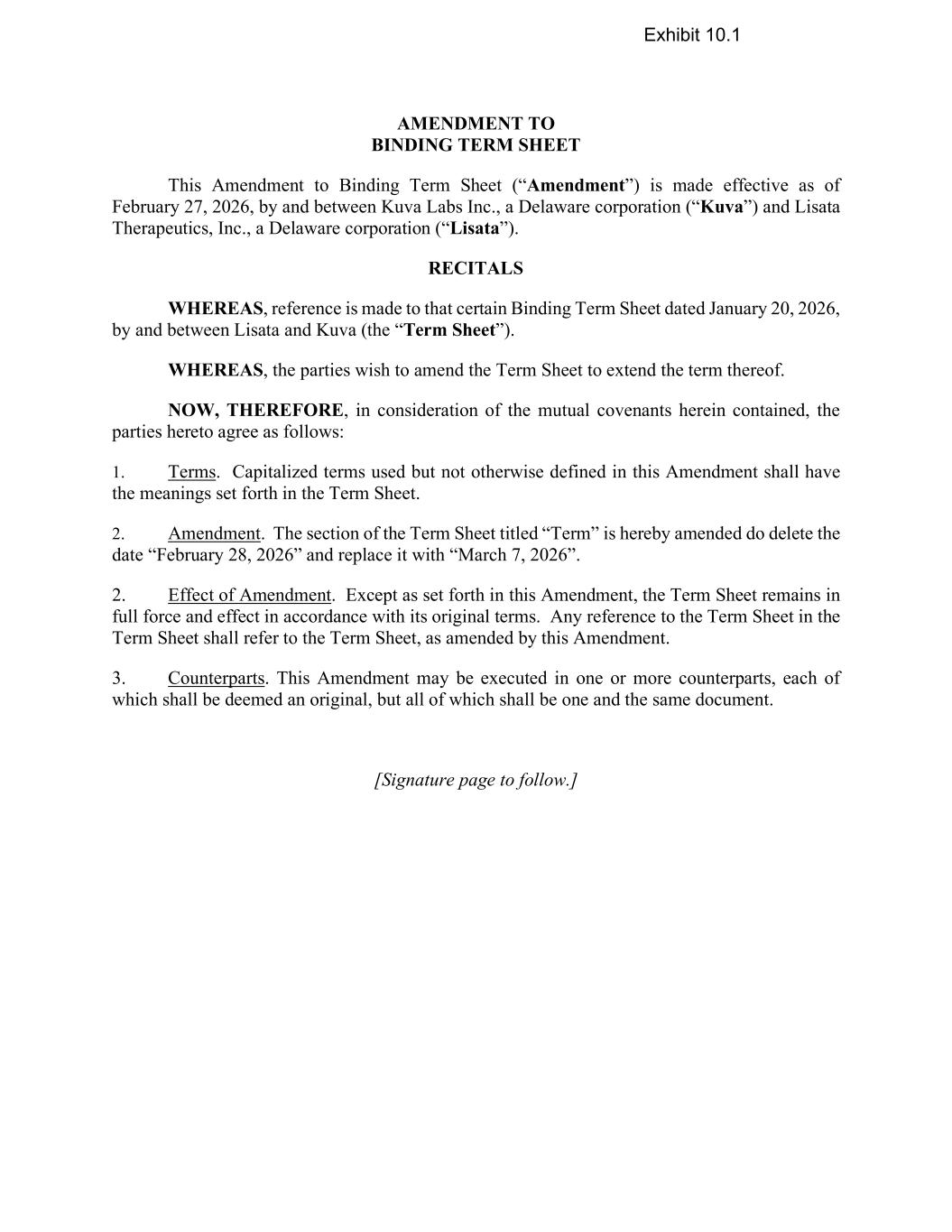 AMENDMENT TO BINDING TERM SHEET This Amendment to Binding Term Sheet (“Amendment”) is made effective as of February 27, 2026, by and between Kuva Labs Inc., a Delaware corporation (“Kuva”) and Lisata Therapeutics, Inc., a Delaware corporation (“Lisata”). RECITALS WHEREAS, reference is made to that certain Binding Term Sheet dated January 20, 2026, by and between Lisata and Kuva (the “Term Sheet”). WHEREAS, the parties wish to amend the Term Sheet to extend the term thereof. NOW, THEREFORE, in consideration of the mutual covenants herein contained, the parties hereto agree as follows: 1. Terms. Capitalized terms used but not otherwise defined in this Amendment shall have the meanings set forth in the Term Sheet. 2. Amendment. The section of the Term Sheet titled “Term” is hereby amended do delete the date “February 28, 2026” and replace it with “March 7, 2026”. 2. Effect of Amendment. Except as set forth in this Amendment, the Term Sheet remains in full force and effect in accordance with its original terms. Any reference to the Term Sheet in the Term Sheet shall refer to the Term Sheet, as amended by this Amendment. 3. Counterparts. This Amendment may be executed in one or more counterparts, each of which shall be deemed an original, but all of which shall be one and the same document. [Signature page to follow.] Exhibit 10.1