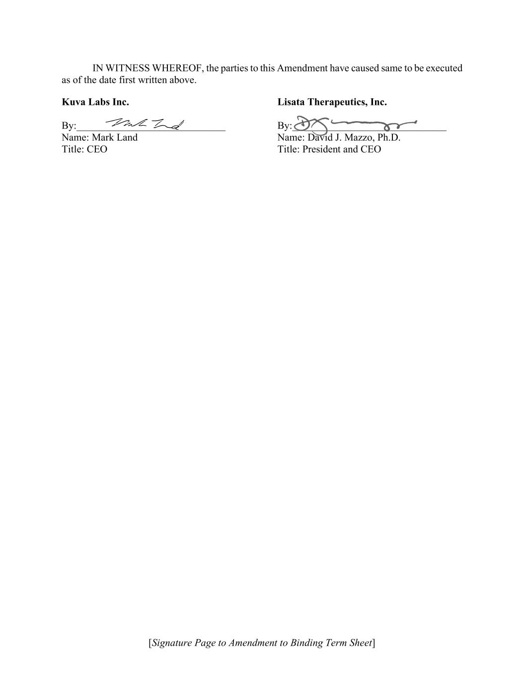 [Signature Page to Amendment to Binding Term Sheet] IN WITNESS WHEREOF, the parties to this Amendment have caused same to be executed as of the date first written above. Lisata Therapeutics, Inc. By:______________________________ Name: David J. Mazzo, Ph.D. Title: President and CEO Kuva Labs Inc. By:_____________________________ Name: Mark Land Title: CEO