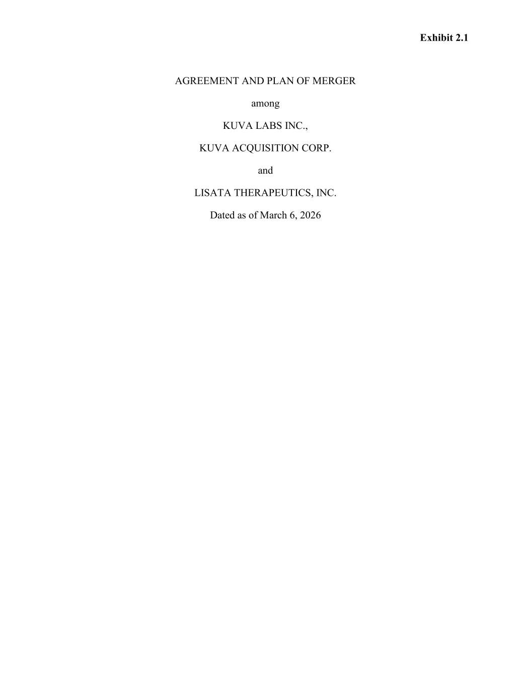 Exhibit 2.1 AGREEMENT AND PLAN OF MERGER among KUVA LABS INC., KUVA ACQUISITION CORP. and LISATA THERAPEUTICS, INC. Dated as of March 6, 2026