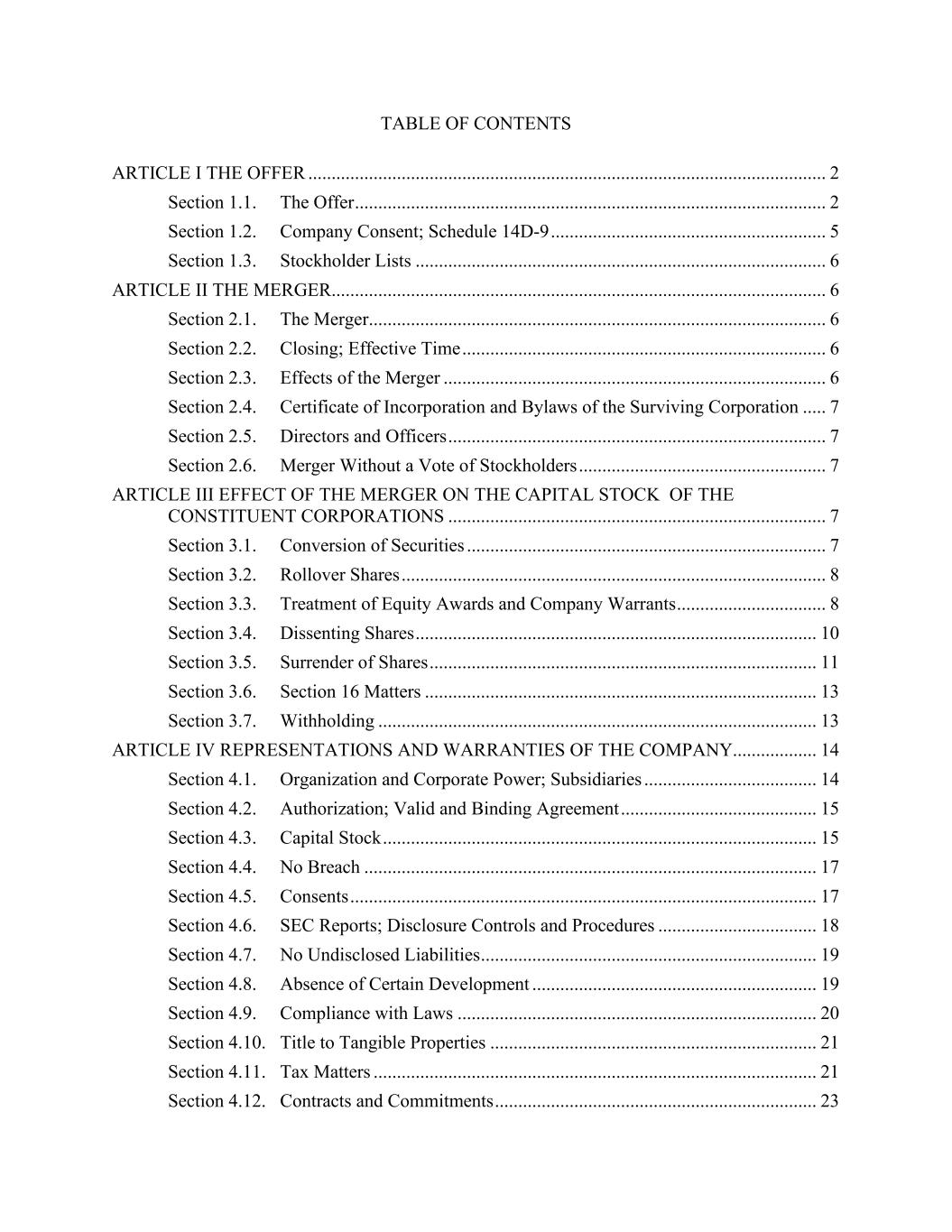 TABLE OF CONTENTS ARTICLE I THE OFFER ............................................................................................................... 2 Section 1.1. The Offer ..................................................................................................... 2 Section 1.2. Company Consent; Schedule 14D-9 ........................................................... 5 Section 1.3. Stockholder Lists ........................................................................................ 6 ARTICLE II THE MERGER.......................................................................................................... 6 Section 2.1. The Merger.................................................................................................. 6 Section 2.2. Closing; Effective Time .............................................................................. 6 Section 2.3. Effects of the Merger .................................................................................. 6 Section 2.4. Certificate of Incorporation and Bylaws of the Surviving Corporation ..... 7 Section 2.5. Directors and Officers ................................................................................. 7 Section 2.6. Merger Without a Vote of Stockholders ..................................................... 7 ARTICLE III EFFECT OF THE MERGER ON THE CAPITAL STOCK OF THE CONSTITUENT CORPORATIONS ................................................................................. 7 Section 3.1. Conversion of Securities ............................................................................. 7 Section 3.2. Rollover Shares ........................................................................................... 8 Section 3.3. Treatment of Equity Awards and Company Warrants ................................ 8 Section 3.4. Dissenting Shares ...................................................................................... 10 Section 3.5. Surrender of Shares ................................................................................... 11 Section 3.6. Section 16 Matters .................................................................................... 13 Section 3.7. Withholding .............................................................................................. 13 ARTICLE IV REPRESENTATIONS AND WARRANTIES OF THE COMPANY.................. 14 Section 4.1. Organization and Corporate Power; Subsidiaries ..................................... 14 Section 4.2. Authorization; Valid and Binding Agreement .......................................... 15 Section 4.3. Capital Stock ............................................................................................. 15 Section 4.4. No Breach ................................................................................................. 17 Section 4.5. Consents .................................................................................................... 17 Section 4.6. SEC Reports; Disclosure Controls and Procedures .................................. 18 Section 4.7. No Undisclosed Liabilities ........................................................................ 19 Section 4.8. Absence of Certain Development ............................................................. 19 Section 4.9. Compliance with Laws ............................................................................. 20 Section 4.10. Title to Tangible Properties ...................................................................... 21 Section 4.11. Tax Matters ............................................................................................... 21 Section 4.12. Contracts and Commitments ..................................................................... 23
