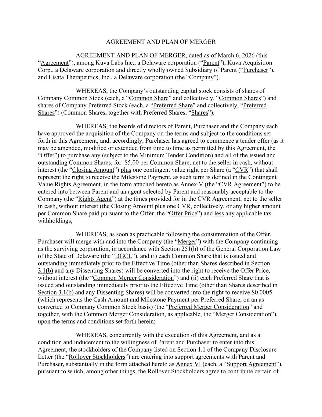 AGREEMENT AND PLAN OF MERGER AGREEMENT AND PLAN OF MERGER, dated as of March 6, 2026 (this “Agreement”), among Kuva Labs Inc., a Delaware corporation (“Parent”), Kuva Acquisition Corp., a Delaware corporation and directly wholly owned Subsidiary of Parent (“Purchaser”), and Lisata Therapeutics, Inc., a Delaware corporation (the “Company”). WHEREAS, the Company’s outstanding capital stock consists of shares of Company Common Stock (each, a “Common Share” and collectively, “Common Shares”) and shares of Company Preferred Stock (each, a “Preferred Share” and collectively, “Preferred Shares”) (Common Shares, together with Preferred Shares, “Shares”); WHEREAS, the boards of directors of Parent, Purchaser and the Company each have approved the acquisition of the Company on the terms and subject to the conditions set forth in this Agreement, and, accordingly, Purchaser has agreed to commence a tender offer (as it may be amended, modified or extended from time to time as permitted by this Agreement, the “Offer”) to purchase any (subject to the Minimum Tender Condition) and all of the issued and outstanding Common Shares, for $5.00 per Common Share, net to the seller in cash, without interest (the “Closing Amount”) plus one contingent value right per Share (a “CVR”) that shall represent the right to receive the Milestone Payment, as such term is defined in the Contingent Value Rights Agreement, in the form attached hereto as Annex V (the “CVR Agreement”) to be entered into between Parent and an agent selected by Parent and reasonably acceptable to the Company (the “Rights Agent”) at the times provided for in the CVR Agreement, net to the seller in cash, without interest (the Closing Amount plus one CVR, collectively, or any higher amount per Common Share paid pursuant to the Offer, the “Offer Price”) and less any applicable tax withholdings; WHEREAS, as soon as practicable following the consummation of the Offer, Purchaser will merge with and into the Company (the “Merger”) with the Company continuing as the surviving corporation, in accordance with Section 251(h) of the General Corporation Law of the State of Delaware (the “DGCL”), and (i) each Common Share that is issued and outstanding immediately prior to the Effective Time (other than Shares described in Section 3.1(b) and any Dissenting Shares) will be converted into the right to receive the Offer Price, without interest (the “Common Merger Consideration”) and (ii) each Preferred Share that is issued and outstanding immediately prior to the Effective Time (other than Shares described in Section 3.1(b) and any Dissenting Shares) will be converted into the right to receive $0.0005 (which represents the Cash Amount and Milestone Payment per Preferred Share, on an as converted to Company Common Stock basis) (the “Preferred Merger Consideration” and together, with the Common Merger Consideration, as applicable, the “Merger Consideration”), upon the terms and conditions set forth herein; WHEREAS, concurrently with the execution of this Agreement, and as a condition and inducement to the willingness of Parent and Purchaser to enter into this Agreement, the stockholders of the Company listed on Section 1.1 of the Company Disclosure Letter (the “Rollover Stockholders”) are entering into support agreements with Parent and Purchaser, substantially in the form attached hereto as Annex VI (each, a “Support Agreement”), pursuant to which, among other things, the Rollover Stockholders agree to contribute certain of