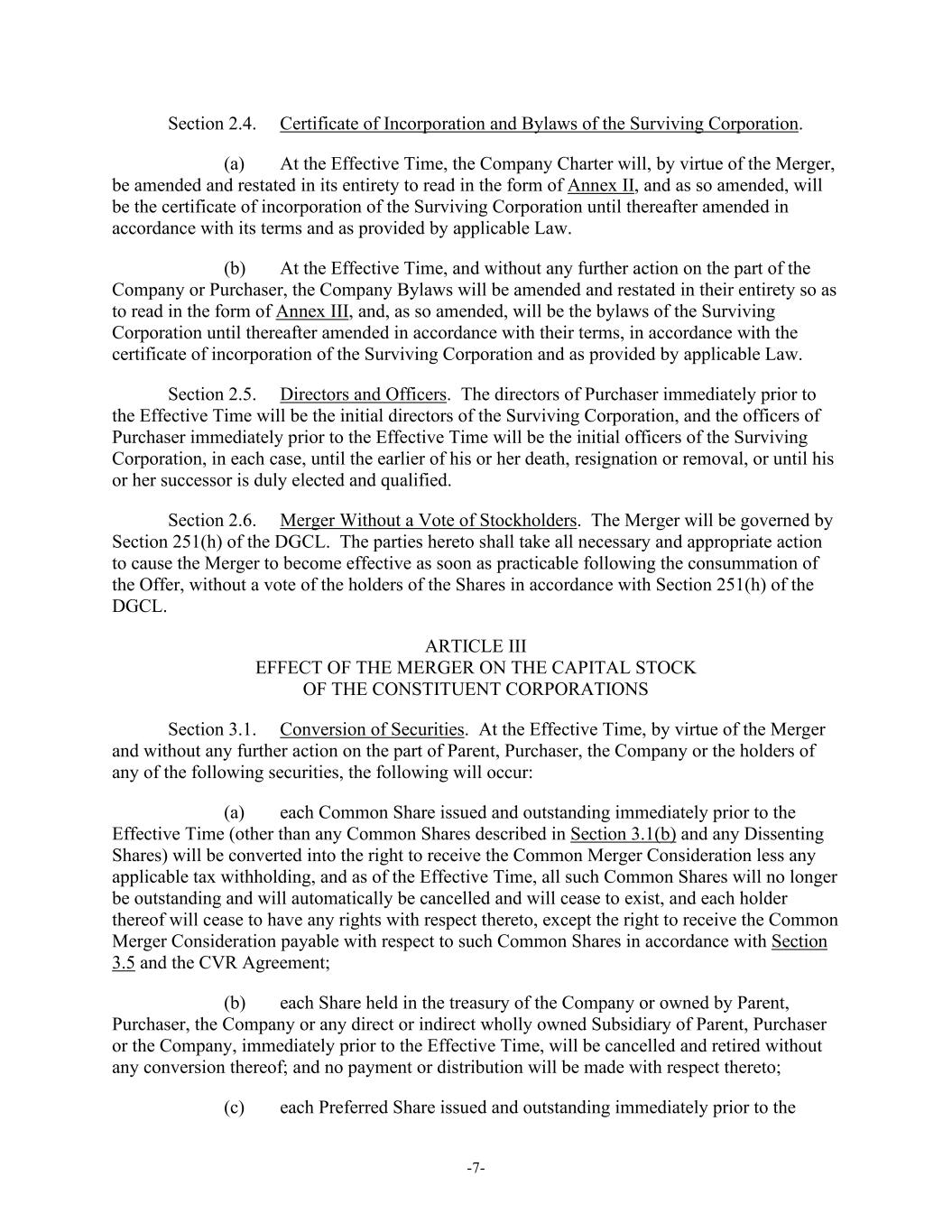 -7- Section 2.4. Certificate of Incorporation and Bylaws of the Surviving Corporation. (a) At the Effective Time, the Company Charter will, by virtue of the Merger, be amended and restated in its entirety to read in the form of Annex II, and as so amended, will be the certificate of incorporation of the Surviving Corporation until thereafter amended in accordance with its terms and as provided by applicable Law. (b) At the Effective Time, and without any further action on the part of the Company or Purchaser, the Company Bylaws will be amended and restated in their entirety so as to read in the form of Annex III, and, as so amended, will be the bylaws of the Surviving Corporation until thereafter amended in accordance with their terms, in accordance with the certificate of incorporation of the Surviving Corporation and as provided by applicable Law. Section 2.5. Directors and Officers. The directors of Purchaser immediately prior to the Effective Time will be the initial directors of the Surviving Corporation, and the officers of Purchaser immediately prior to the Effective Time will be the initial officers of the Surviving Corporation, in each case, until the earlier of his or her death, resignation or removal, or until his or her successor is duly elected and qualified. Section 2.6. Merger Without a Vote of Stockholders. The Merger will be governed by Section 251(h) of the DGCL. The parties hereto shall take all necessary and appropriate action to cause the Merger to become effective as soon as practicable following the consummation of the Offer, without a vote of the holders of the Shares in accordance with Section 251(h) of the DGCL. ARTICLE III EFFECT OF THE MERGER ON THE CAPITAL STOCK OF THE CONSTITUENT CORPORATIONS Section 3.1. Conversion of Securities. At the Effective Time, by virtue of the Merger and without any further action on the part of Parent, Purchaser, the Company or the holders of any of the following securities, the following will occur: (a) each Common Share issued and outstanding immediately prior to the Effective Time (other than any Common Shares described in Section 3.1(b) and any Dissenting Shares) will be converted into the right to receive the Common Merger Consideration less any applicable tax withholding, and as of the Effective Time, all such Common Shares will no longer be outstanding and will automatically be cancelled and will cease to exist, and each holder thereof will cease to have any rights with respect thereto, except the right to receive the Common Merger Consideration payable with respect to such Common Shares in accordance with Section 3.5 and the CVR Agreement; (b) each Share held in the treasury of the Company or owned by Parent, Purchaser, the Company or any direct or indirect wholly owned Subsidiary of Parent, Purchaser or the Company, immediately prior to the Effective Time, will be cancelled and retired without any conversion thereof; and no payment or distribution will be made with respect thereto; (c) each Preferred Share issued and outstanding immediately prior to the