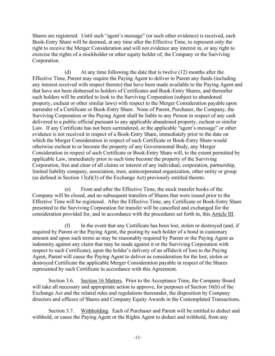 -13- Shares are registered. Until such “agent’s message” (or such other evidence) is received, each Book-Entry Share will be deemed, at any time after the Effective Time, to represent only the right to receive the Merger Consideration and will not evidence any interest in, or any right to exercise the rights of a stockholder or other equity holder of, the Company or the Surviving Corporation. (d) At any time following the date that is twelve (12) months after the Effective Time, Parent may require the Paying Agent to deliver to Parent any funds (including any interest received with respect thereto) that have been made available to the Paying Agent and that have not been disbursed to holders of Certificates and Book-Entry Shares, and thereafter such holders will be entitled to look to the Surviving Corporation (subject to abandoned property, escheat or other similar laws) with respect to the Merger Consideration payable upon surrender of a Certificate or Book-Entry Share. None of Parent, Purchaser, the Company, the Surviving Corporation or the Paying Agent shall be liable to any Person in respect of any cash delivered to a public official pursuant to any applicable abandoned property, escheat or similar Law. If any Certificate has not been surrendered, or the applicable “agent’s message” or other evidence is not received in respect of a Book-Entry Share, immediately prior to the date on which the Merger Consideration in respect of such Certificate or Book-Entry Share would otherwise escheat to or become the property of any Governmental Body, any Merger Consideration in respect of such Certificate or Book-Entry Share will, to the extent permitted by applicable Law, immediately prior to such time become the property of the Surviving Corporation, free and clear of all claims or interest of any individual, corporation, partnership, limited liability company, association, trust, unincorporated organization, other entity or group (as defined in Section 13(d)(3) of the Exchange Act) previously entitled thereto. (e) From and after the Effective Time, the stock transfer books of the Company will be closed, and no subsequent transfers of Shares that were issued prior to the Effective Time will be registered. After the Effective Time, any Certificate or Book-Entry Share presented to the Surviving Corporation for transfer will be cancelled and exchanged for the consideration provided for, and in accordance with the procedures set forth in, this Article III. (f) In the event that any Certificate has been lost, stolen or destroyed (and, if required by Parent or the Paying Agent, the posting by such holder of a bond in customary amount and upon such terms as may be reasonably required by Parent or the Paying Agent as indemnity against any claim that may be made against it or the Surviving Corporation with respect to such Certificate), upon the holder’s delivery of an affidavit of loss to the Paying Agent, Parent will cause the Paying Agent to deliver as consideration for the lost, stolen or destroyed Certificate the applicable Merger Consideration payable in respect of the Shares represented by such Certificate in accordance with this Agreement. Section 3.6. Section 16 Matters. Prior to the Acceptance Time, the Company Board will take all necessary and appropriate action to approve, for purposes of Section 16(b) of the Exchange Act and the related rules and regulations thereunder, the disposition by Company directors and officers of Shares and Company Equity Awards in the Contemplated Transactions. Section 3.7. Withholding. Each of Purchaser and Parent will be entitled to deduct and withhold, or cause the Paying Agent or the Rights Agent to deduct and withhold, from any