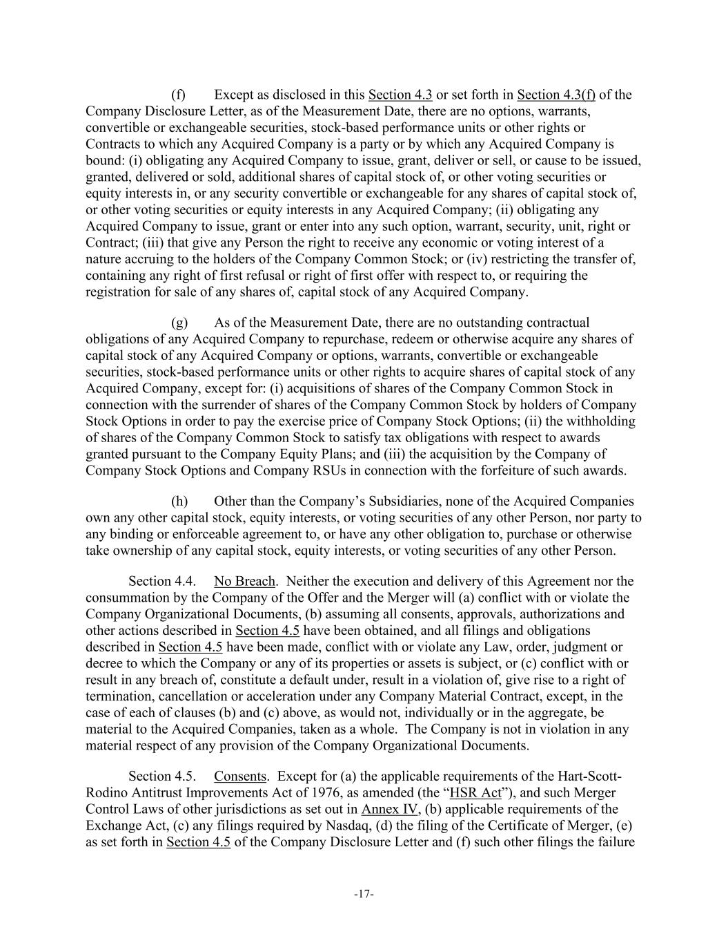-17- (f) Except as disclosed in this Section 4.3 or set forth in Section 4.3(f) of the Company Disclosure Letter, as of the Measurement Date, there are no options, warrants, convertible or exchangeable securities, stock-based performance units or other rights or Contracts to which any Acquired Company is a party or by which any Acquired Company is bound: (i) obligating any Acquired Company to issue, grant, deliver or sell, or cause to be issued, granted, delivered or sold, additional shares of capital stock of, or other voting securities or equity interests in, or any security convertible or exchangeable for any shares of capital stock of, or other voting securities or equity interests in any Acquired Company; (ii) obligating any Acquired Company to issue, grant or enter into any such option, warrant, security, unit, right or Contract; (iii) that give any Person the right to receive any economic or voting interest of a nature accruing to the holders of the Company Common Stock; or (iv) restricting the transfer of, containing any right of first refusal or right of first offer with respect to, or requiring the registration for sale of any shares of, capital stock of any Acquired Company. (g) As of the Measurement Date, there are no outstanding contractual obligations of any Acquired Company to repurchase, redeem or otherwise acquire any shares of capital stock of any Acquired Company or options, warrants, convertible or exchangeable securities, stock-based performance units or other rights to acquire shares of capital stock of any Acquired Company, except for: (i) acquisitions of shares of the Company Common Stock in connection with the surrender of shares of the Company Common Stock by holders of Company Stock Options in order to pay the exercise price of Company Stock Options; (ii) the withholding of shares of the Company Common Stock to satisfy tax obligations with respect to awards granted pursuant to the Company Equity Plans; and (iii) the acquisition by the Company of Company Stock Options and Company RSUs in connection with the forfeiture of such awards. (h) Other than the Company’s Subsidiaries, none of the Acquired Companies own any other capital stock, equity interests, or voting securities of any other Person, nor party to any binding or enforceable agreement to, or have any other obligation to, purchase or otherwise take ownership of any capital stock, equity interests, or voting securities of any other Person. Section 4.4. No Breach. Neither the execution and delivery of this Agreement nor the consummation by the Company of the Offer and the Merger will (a) conflict with or violate the Company Organizational Documents, (b) assuming all consents, approvals, authorizations and other actions described in Section 4.5 have been obtained, and all filings and obligations described in Section 4.5 have been made, conflict with or violate any Law, order, judgment or decree to which the Company or any of its properties or assets is subject, or (c) conflict with or result in any breach of, constitute a default under, result in a violation of, give rise to a right of termination, cancellation or acceleration under any Company Material Contract, except, in the case of each of clauses (b) and (c) above, as would not, individually or in the aggregate, be material to the Acquired Companies, taken as a whole. The Company is not in violation in any material respect of any provision of the Company Organizational Documents. Section 4.5. Consents. Except for (a) the applicable requirements of the Hart-Scott- Rodino Antitrust Improvements Act of 1976, as amended (the “HSR Act”), and such Merger Control Laws of other jurisdictions as set out in Annex IV, (b) applicable requirements of the Exchange Act, (c) any filings required by Nasdaq, (d) the filing of the Certificate of Merger, (e) as set forth in Section 4.5 of the Company Disclosure Letter and (f) such other filings the failure