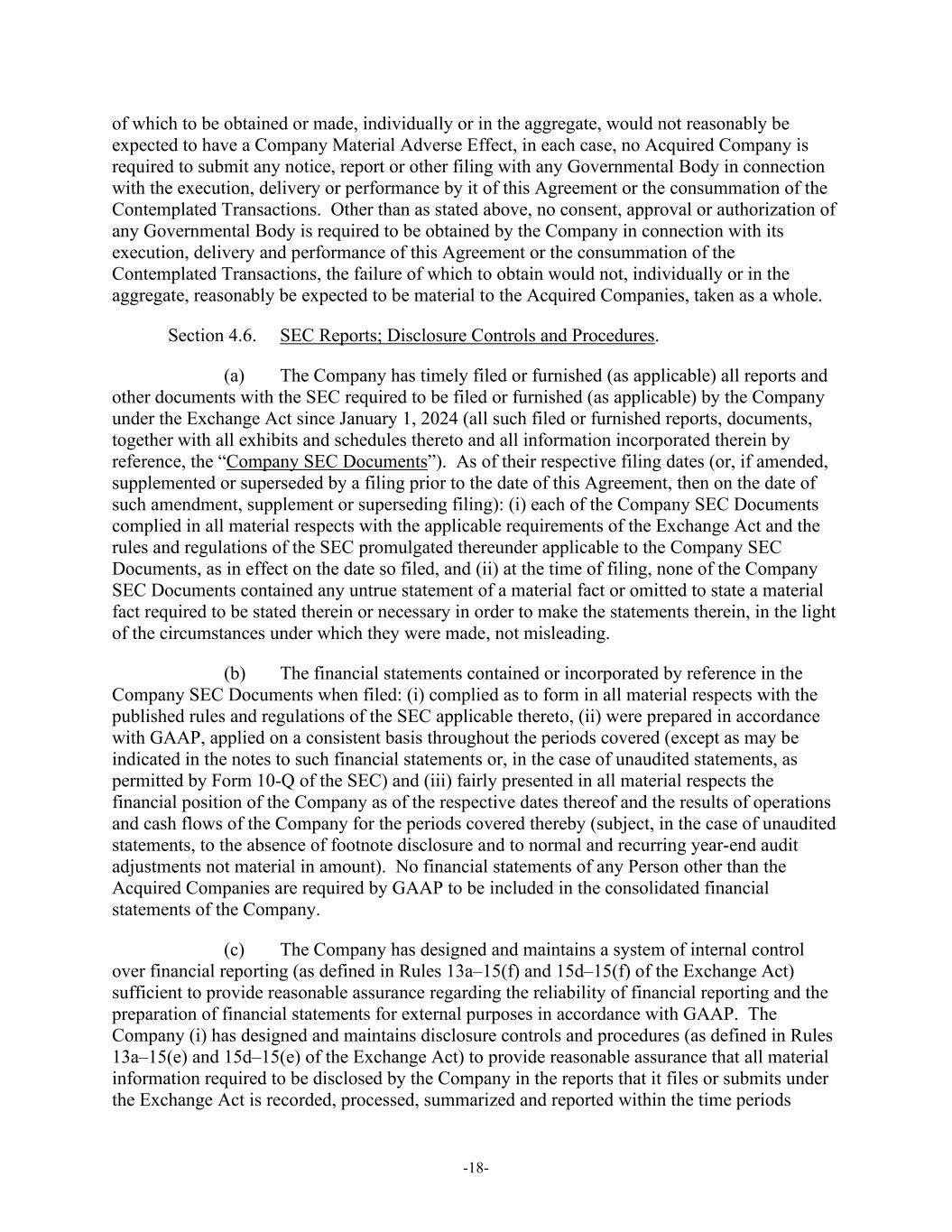 -18- of which to be obtained or made, individually or in the aggregate, would not reasonably be expected to have a Company Material Adverse Effect, in each case, no Acquired Company is required to submit any notice, report or other filing with any Governmental Body in connection with the execution, delivery or performance by it of this Agreement or the consummation of the Contemplated Transactions. Other than as stated above, no consent, approval or authorization of any Governmental Body is required to be obtained by the Company in connection with its execution, delivery and performance of this Agreement or the consummation of the Contemplated Transactions, the failure of which to obtain would not, individually or in the aggregate, reasonably be expected to be material to the Acquired Companies, taken as a whole. Section 4.6. SEC Reports; Disclosure Controls and Procedures. (a) The Company has timely filed or furnished (as applicable) all reports and other documents with the SEC required to be filed or furnished (as applicable) by the Company under the Exchange Act since January 1, 2024 (all such filed or furnished reports, documents, together with all exhibits and schedules thereto and all information incorporated therein by reference, the “Company SEC Documents”). As of their respective filing dates (or, if amended, supplemented or superseded by a filing prior to the date of this Agreement, then on the date of such amendment, supplement or superseding filing): (i) each of the Company SEC Documents complied in all material respects with the applicable requirements of the Exchange Act and the rules and regulations of the SEC promulgated thereunder applicable to the Company SEC Documents, as in effect on the date so filed, and (ii) at the time of filing, none of the Company SEC Documents contained any untrue statement of a material fact or omitted to state a material fact required to be stated therein or necessary in order to make the statements therein, in the light of the circumstances under which they were made, not misleading. (b) The financial statements contained or incorporated by reference in the Company SEC Documents when filed: (i) complied as to form in all material respects with the published rules and regulations of the SEC applicable thereto, (ii) were prepared in accordance with GAAP, applied on a consistent basis throughout the periods covered (except as may be indicated in the notes to such financial statements or, in the case of unaudited statements, as permitted by Form 10-Q of the SEC) and (iii) fairly presented in all material respects the financial position of the Company as of the respective dates thereof and the results of operations and cash flows of the Company for the periods covered thereby (subject, in the case of unaudited statements, to the absence of footnote disclosure and to normal and recurring year-end audit adjustments not material in amount). No financial statements of any Person other than the Acquired Companies are required by GAAP to be included in the consolidated financial statements of the Company. (c) The Company has designed and maintains a system of internal control over financial reporting (as defined in Rules 13a–15(f) and 15d–15(f) of the Exchange Act) sufficient to provide reasonable assurance regarding the reliability of financial reporting and the preparation of financial statements for external purposes in accordance with GAAP. The Company (i) has designed and maintains disclosure controls and procedures (as defined in Rules 13a–15(e) and 15d–15(e) of the Exchange Act) to provide reasonable assurance that all material information required to be disclosed by the Company in the reports that it files or submits under the Exchange Act is recorded, processed, summarized and reported within the time periods