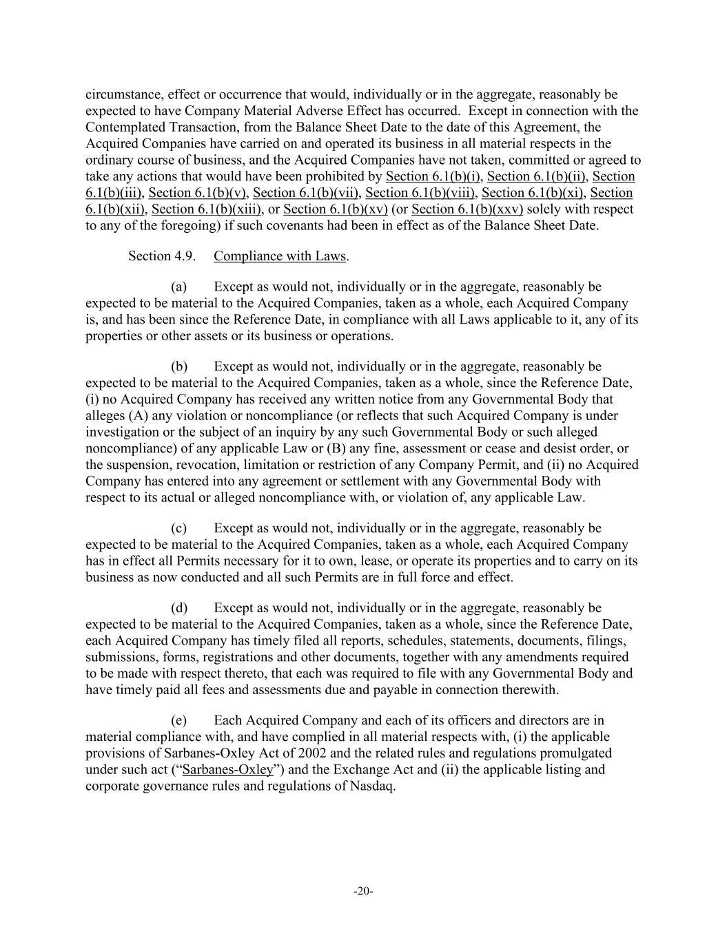 -20- circumstance, effect or occurrence that would, individually or in the aggregate, reasonably be expected to have Company Material Adverse Effect has occurred. Except in connection with the Contemplated Transaction, from the Balance Sheet Date to the date of this Agreement, the Acquired Companies have carried on and operated its business in all material respects in the ordinary course of business, and the Acquired Companies have not taken, committed or agreed to take any actions that would have been prohibited by Section 6.1(b)(i), Section 6.1(b)(ii), Section 6.1(b)(iii), Section 6.1(b)(v), Section 6.1(b)(vii), Section 6.1(b)(viii), Section 6.1(b)(xi), Section 6.1(b)(xii), Section 6.1(b)(xiii), or Section 6.1(b)(xv) (or Section 6.1(b)(xxv) solely with respect to any of the foregoing) if such covenants had been in effect as of the Balance Sheet Date. Section 4.9. Compliance with Laws. (a) Except as would not, individually or in the aggregate, reasonably be expected to be material to the Acquired Companies, taken as a whole, each Acquired Company is, and has been since the Reference Date, in compliance with all Laws applicable to it, any of its properties or other assets or its business or operations. (b) Except as would not, individually or in the aggregate, reasonably be expected to be material to the Acquired Companies, taken as a whole, since the Reference Date, (i) no Acquired Company has received any written notice from any Governmental Body that alleges (A) any violation or noncompliance (or reflects that such Acquired Company is under investigation or the subject of an inquiry by any such Governmental Body or such alleged noncompliance) of any applicable Law or (B) any fine, assessment or cease and desist order, or the suspension, revocation, limitation or restriction of any Company Permit, and (ii) no Acquired Company has entered into any agreement or settlement with any Governmental Body with respect to its actual or alleged noncompliance with, or violation of, any applicable Law. (c) Except as would not, individually or in the aggregate, reasonably be expected to be material to the Acquired Companies, taken as a whole, each Acquired Company has in effect all Permits necessary for it to own, lease, or operate its properties and to carry on its business as now conducted and all such Permits are in full force and effect. (d) Except as would not, individually or in the aggregate, reasonably be expected to be material to the Acquired Companies, taken as a whole, since the Reference Date, each Acquired Company has timely filed all reports, schedules, statements, documents, filings, submissions, forms, registrations and other documents, together with any amendments required to be made with respect thereto, that each was required to file with any Governmental Body and have timely paid all fees and assessments due and payable in connection therewith. (e) Each Acquired Company and each of its officers and directors are in material compliance with, and have complied in all material respects with, (i) the applicable provisions of Sarbanes-Oxley Act of 2002 and the related rules and regulations promulgated under such act (“Sarbanes-Oxley”) and the Exchange Act and (ii) the applicable listing and corporate governance rules and regulations of Nasdaq.