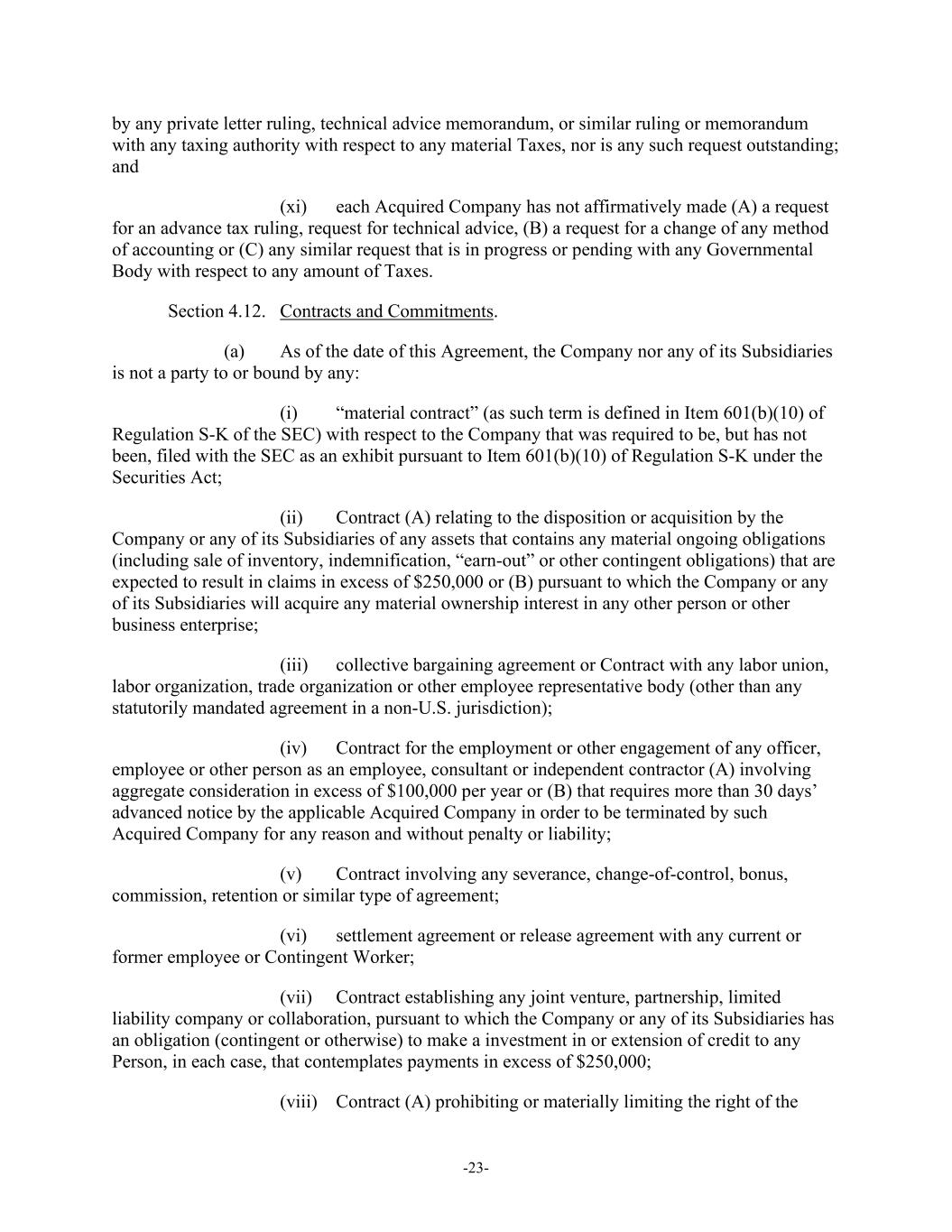 -23- by any private letter ruling, technical advice memorandum, or similar ruling or memorandum with any taxing authority with respect to any material Taxes, nor is any such request outstanding; and (xi) each Acquired Company has not affirmatively made (A) a request for an advance tax ruling, request for technical advice, (B) a request for a change of any method of accounting or (C) any similar request that is in progress or pending with any Governmental Body with respect to any amount of Taxes. Section 4.12. Contracts and Commitments. (a) As of the date of this Agreement, the Company nor any of its Subsidiaries is not a party to or bound by any: (i) “material contract” (as such term is defined in Item 601(b)(10) of Regulation S-K of the SEC) with respect to the Company that was required to be, but has not been, filed with the SEC as an exhibit pursuant to Item 601(b)(10) of Regulation S-K under the Securities Act; (ii) Contract (A) relating to the disposition or acquisition by the Company or any of its Subsidiaries of any assets that contains any material ongoing obligations (including sale of inventory, indemnification, “earn-out” or other contingent obligations) that are expected to result in claims in excess of $250,000 or (B) pursuant to which the Company or any of its Subsidiaries will acquire any material ownership interest in any other person or other business enterprise; (iii) collective bargaining agreement or Contract with any labor union, labor organization, trade organization or other employee representative body (other than any statutorily mandated agreement in a non-U.S. jurisdiction); (iv) Contract for the employment or other engagement of any officer, employee or other person as an employee, consultant or independent contractor (A) involving aggregate consideration in excess of $100,000 per year or (B) that requires more than 30 days’ advanced notice by the applicable Acquired Company in order to be terminated by such Acquired Company for any reason and without penalty or liability; (v) Contract involving any severance, change-of-control, bonus, commission, retention or similar type of agreement; (vi) settlement agreement or release agreement with any current or former employee or Contingent Worker; (vii) Contract establishing any joint venture, partnership, limited liability company or collaboration, pursuant to which the Company or any of its Subsidiaries has an obligation (contingent or otherwise) to make a investment in or extension of credit to any Person, in each case, that contemplates payments in excess of $250,000; (viii) Contract (A) prohibiting or materially limiting the right of the