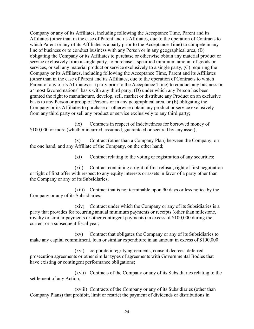 -24- Company or any of its Affiliates, including following the Acceptance Time, Parent and its Affiliates (other than in the case of Parent and its Affiliates, due to the operation of Contracts to which Parent or any of its Affiliates is a party prior to the Acceptance Time) to compete in any line of business or to conduct business with any Person or in any geographical area, (B) obligating the Company or its Affiliates to purchase or otherwise obtain any material product or service exclusively from a single party, to purchase a specified minimum amount of goods or services, or sell any material product or service exclusively to a single party, (C) requiring the Company or its Affiliates, including following the Acceptance Time, Parent and its Affiliates (other than in the case of Parent and its Affiliates, due to the operation of Contracts to which Parent or any of its Affiliates is a party prior to the Acceptance Time) to conduct any business on a “most favored nations” basis with any third party, (D) under which any Person has been granted the right to manufacture, develop, sell, market or distribute any Product on an exclusive basis to any Person or group of Persons or in any geographical area, or (E) obligating the Company or its Affiliates to purchase or otherwise obtain any product or service exclusively from any third party or sell any product or service exclusively to any third party; (ix) Contracts in respect of Indebtedness for borrowed money of $100,000 or more (whether incurred, assumed, guaranteed or secured by any asset); (x) Contract (other than a Company Plan) between the Company, on the one hand, and any Affiliate of the Company, on the other hand; (xi) Contract relating to the voting or registration of any securities; (xii) Contract containing a right of first refusal, right of first negotiation or right of first offer with respect to any equity interests or assets in favor of a party other than the Company or any of its Subsidiaries; (xiii) Contract that is not terminable upon 90 days or less notice by the Company or any of its Subsidiaries; (xiv) Contract under which the Company or any of its Subsidiaries is a party that provides for recurring annual minimum payments or receipts (other than milestone, royalty or similar payments or other contingent payments) in excess of $100,000 during the current or a subsequent fiscal year; (xv) Contract that obligates the Company or any of its Subsidiaries to make any capital commitment, loan or similar expenditure in an amount in excess of $100,000; (xvi) corporate integrity agreements, consent decrees, deferred prosecution agreements or other similar types of agreements with Governmental Bodies that have existing or contingent performance obligations; (xvii) Contracts of the Company or any of its Subsidiaries relating to the settlement of any Action; (xviii) Contracts of the Company or any of its Subsidiaries (other than Company Plans) that prohibit, limit or restrict the payment of dividends or distributions in
