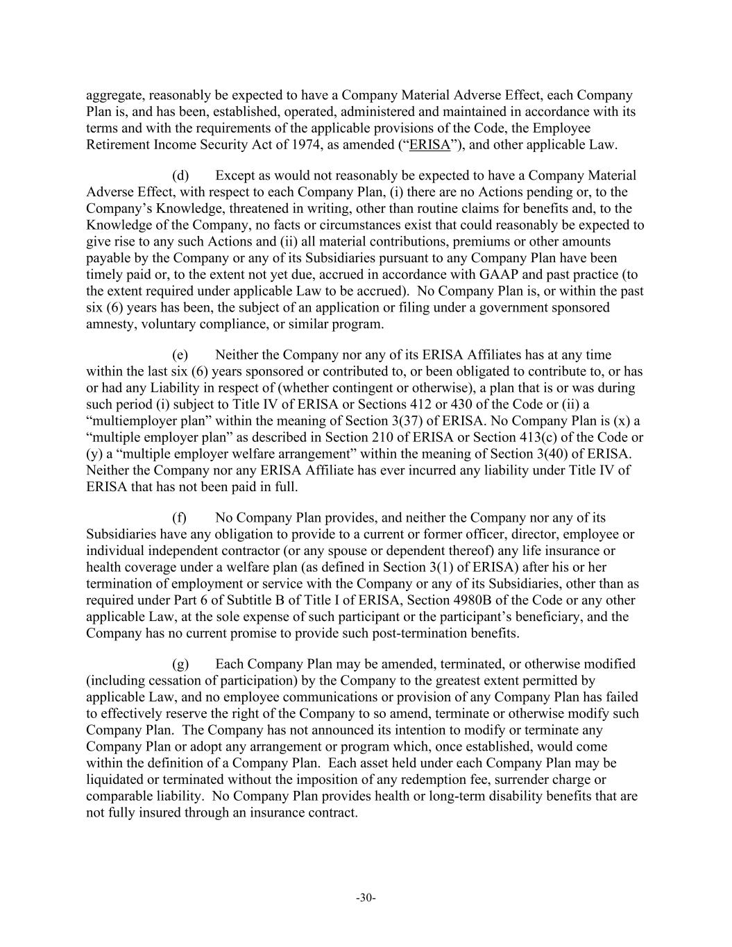 -30- aggregate, reasonably be expected to have a Company Material Adverse Effect, each Company Plan is, and has been, established, operated, administered and maintained in accordance with its terms and with the requirements of the applicable provisions of the Code, the Employee Retirement Income Security Act of 1974, as amended (“ERISA”), and other applicable Law. (d) Except as would not reasonably be expected to have a Company Material Adverse Effect, with respect to each Company Plan, (i) there are no Actions pending or, to the Company’s Knowledge, threatened in writing, other than routine claims for benefits and, to the Knowledge of the Company, no facts or circumstances exist that could reasonably be expected to give rise to any such Actions and (ii) all material contributions, premiums or other amounts payable by the Company or any of its Subsidiaries pursuant to any Company Plan have been timely paid or, to the extent not yet due, accrued in accordance with GAAP and past practice (to the extent required under applicable Law to be accrued). No Company Plan is, or within the past six (6) years has been, the subject of an application or filing under a government sponsored amnesty, voluntary compliance, or similar program. (e) Neither the Company nor any of its ERISA Affiliates has at any time within the last six (6) years sponsored or contributed to, or been obligated to contribute to, or has or had any Liability in respect of (whether contingent or otherwise), a plan that is or was during such period (i) subject to Title IV of ERISA or Sections 412 or 430 of the Code or (ii) a “multiemployer plan” within the meaning of Section 3(37) of ERISA. No Company Plan is (x) a “multiple employer plan” as described in Section 210 of ERISA or Section 413(c) of the Code or (y) a “multiple employer welfare arrangement” within the meaning of Section 3(40) of ERISA. Neither the Company nor any ERISA Affiliate has ever incurred any liability under Title IV of ERISA that has not been paid in full. (f) No Company Plan provides, and neither the Company nor any of its Subsidiaries have any obligation to provide to a current or former officer, director, employee or individual independent contractor (or any spouse or dependent thereof) any life insurance or health coverage under a welfare plan (as defined in Section 3(1) of ERISA) after his or her termination of employment or service with the Company or any of its Subsidiaries, other than as required under Part 6 of Subtitle B of Title I of ERISA, Section 4980B of the Code or any other applicable Law, at the sole expense of such participant or the participant’s beneficiary, and the Company has no current promise to provide such post-termination benefits. (g) Each Company Plan may be amended, terminated, or otherwise modified (including cessation of participation) by the Company to the greatest extent permitted by applicable Law, and no employee communications or provision of any Company Plan has failed to effectively reserve the right of the Company to so amend, terminate or otherwise modify such Company Plan. The Company has not announced its intention to modify or terminate any Company Plan or adopt any arrangement or program which, once established, would come within the definition of a Company Plan. Each asset held under each Company Plan may be liquidated or terminated without the imposition of any redemption fee, surrender charge or comparable liability. No Company Plan provides health or long-term disability benefits that are not fully insured through an insurance contract.