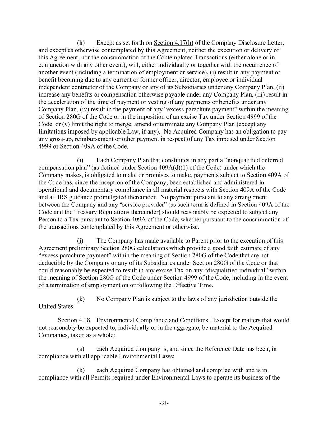 -31- (h) Except as set forth on Section 4.17(h) of the Company Disclosure Letter, and except as otherwise contemplated by this Agreement, neither the execution or delivery of this Agreement, nor the consummation of the Contemplated Transactions (either alone or in conjunction with any other event), will, either individually or together with the occurrence of another event (including a termination of employment or service), (i) result in any payment or benefit becoming due to any current or former officer, director, employee or individual independent contractor of the Company or any of its Subsidiaries under any Company Plan, (ii) increase any benefits or compensation otherwise payable under any Company Plan, (iii) result in the acceleration of the time of payment or vesting of any payments or benefits under any Company Plan, (iv) result in the payment of any “excess parachute payment” within the meaning of Section 280G of the Code or in the imposition of an excise Tax under Section 4999 of the Code, or (v) limit the right to merge, amend or terminate any Company Plan (except any limitations imposed by applicable Law, if any). No Acquired Company has an obligation to pay any gross-up, reimbursement or other payment in respect of any Tax imposed under Section 4999 or Section 409A of the Code. (i) Each Company Plan that constitutes in any part a “nonqualified deferred compensation plan” (as defined under Section 409A(d)(1) of the Code) under which the Company makes, is obligated to make or promises to make, payments subject to Section 409A of the Code has, since the inception of the Company, been established and administered in operational and documentary compliance in all material respects with Section 409A of the Code and all IRS guidance promulgated thereunder. No payment pursuant to any arrangement between the Company and any “service provider” (as such term is defined in Section 409A of the Code and the Treasury Regulations thereunder) should reasonably be expected to subject any Person to a Tax pursuant to Section 409A of the Code, whether pursuant to the consummation of the transactions contemplated by this Agreement or otherwise. (j) The Company has made available to Parent prior to the execution of this Agreement preliminary Section 280G calculations which provide a good faith estimate of any “excess parachute payment” within the meaning of Section 280G of the Code that are not deductible by the Company or any of its Subsidiaries under Section 280G of the Code or that could reasonably be expected to result in any excise Tax on any “disqualified individual” within the meaning of Section 280G of the Code under Section 4999 of the Code, including in the event of a termination of employment on or following the Effective Time. (k) No Company Plan is subject to the laws of any jurisdiction outside the United States. Section 4.18. Environmental Compliance and Conditions. Except for matters that would not reasonably be expected to, individually or in the aggregate, be material to the Acquired Companies, taken as a whole: (a) each Acquired Company is, and since the Reference Date has been, in compliance with all applicable Environmental Laws; (b) each Acquired Company has obtained and compiled with and is in compliance with all Permits required under Environmental Laws to operate its business of the