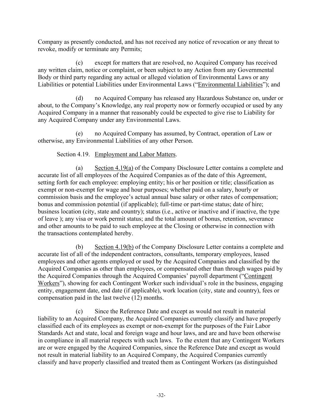 -32- Company as presently conducted, and has not received any notice of revocation or any threat to revoke, modify or terminate any Permits; (c) except for matters that are resolved, no Acquired Company has received any written claim, notice or complaint, or been subject to any Action from any Governmental Body or third party regarding any actual or alleged violation of Environmental Laws or any Liabilities or potential Liabilities under Environmental Laws (“Environmental Liabilities”); and (d) no Acquired Company has released any Hazardous Substance on, under or about, to the Company’s Knowledge, any real property now or formerly occupied or used by any Acquired Company in a manner that reasonably could be expected to give rise to Liability for any Acquired Company under any Environmental Laws. (e) no Acquired Company has assumed, by Contract, operation of Law or otherwise, any Environmental Liabilities of any other Person. Section 4.19. Employment and Labor Matters. (a) Section 4.19(a) of the Company Disclosure Letter contains a complete and accurate list of all employees of the Acquired Companies as of the date of this Agreement, setting forth for each employee: employing entity; his or her position or title; classification as exempt or non-exempt for wage and hour purposes; whether paid on a salary, hourly or commission basis and the employee’s actual annual base salary or other rates of compensation; bonus and commission potential (if applicable); full-time or part-time status; date of hire; business location (city, state and country); status (i.e., active or inactive and if inactive, the type of leave ); any visa or work permit status; and the total amount of bonus, retention, severance and other amounts to be paid to such employee at the Closing or otherwise in connection with the transactions contemplated hereby. (b) Section 4.19(b) of the Company Disclosure Letter contains a complete and accurate list of all of the independent contractors, consultants, temporary employees, leased employees and other agents employed or used by the Acquired Companies and classified by the Acquired Companies as other than employees, or compensated other than through wages paid by the Acquired Companies through the Acquired Companies’ payroll department (“Contingent Workers”), showing for each Contingent Worker such individual’s role in the business, engaging entity, engagement date, end date (if applicable), work location (city, state and country), fees or compensation paid in the last twelve (12) months. (c) Since the Reference Date and except as would not result in material liability to an Acquired Company, the Acquired Companies currently classify and have properly classified each of its employees as exempt or non-exempt for the purposes of the Fair Labor Standards Act and state, local and foreign wage and hour laws, and are and have been otherwise in compliance in all material respects with such laws. To the extent that any Contingent Workers are or were engaged by the Acquired Companies, since the Reference Date and except as would not result in material liability to an Acquired Company, the Acquired Companies currently classify and have properly classified and treated them as Contingent Workers (as distinguished