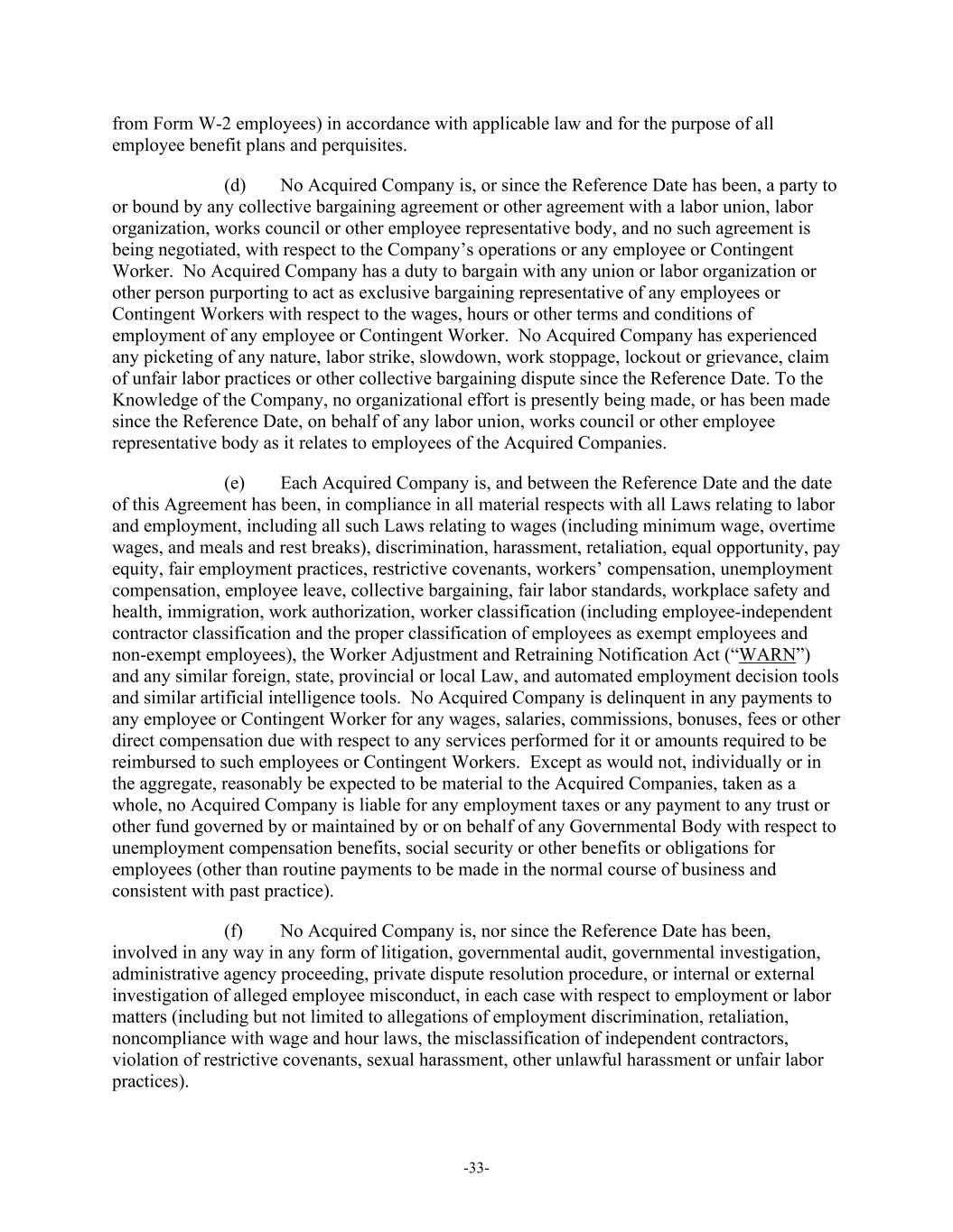-33- from Form W-2 employees) in accordance with applicable law and for the purpose of all employee benefit plans and perquisites. (d) No Acquired Company is, or since the Reference Date has been, a party to or bound by any collective bargaining agreement or other agreement with a labor union, labor organization, works council or other employee representative body, and no such agreement is being negotiated, with respect to the Company’s operations or any employee or Contingent Worker. No Acquired Company has a duty to bargain with any union or labor organization or other person purporting to act as exclusive bargaining representative of any employees or Contingent Workers with respect to the wages, hours or other terms and conditions of employment of any employee or Contingent Worker. No Acquired Company has experienced any picketing of any nature, labor strike, slowdown, work stoppage, lockout or grievance, claim of unfair labor practices or other collective bargaining dispute since the Reference Date. To the Knowledge of the Company, no organizational effort is presently being made, or has been made since the Reference Date, on behalf of any labor union, works council or other employee representative body as it relates to employees of the Acquired Companies. (e) Each Acquired Company is, and between the Reference Date and the date of this Agreement has been, in compliance in all material respects with all Laws relating to labor and employment, including all such Laws relating to wages (including minimum wage, overtime wages, and meals and rest breaks), discrimination, harassment, retaliation, equal opportunity, pay equity, fair employment practices, restrictive covenants, workers’ compensation, unemployment compensation, employee leave, collective bargaining, fair labor standards, workplace safety and health, immigration, work authorization, worker classification (including employee-independent contractor classification and the proper classification of employees as exempt employees and non-exempt employees), the Worker Adjustment and Retraining Notification Act (“WARN”) and any similar foreign, state, provincial or local Law, and automated employment decision tools and similar artificial intelligence tools. No Acquired Company is delinquent in any payments to any employee or Contingent Worker for any wages, salaries, commissions, bonuses, fees or other direct compensation due with respect to any services performed for it or amounts required to be reimbursed to such employees or Contingent Workers. Except as would not, individually or in the aggregate, reasonably be expected to be material to the Acquired Companies, taken as a whole, no Acquired Company is liable for any employment taxes or any payment to any trust or other fund governed by or maintained by or on behalf of any Governmental Body with respect to unemployment compensation benefits, social security or other benefits or obligations for employees (other than routine payments to be made in the normal course of business and consistent with past practice). (f) No Acquired Company is, nor since the Reference Date has been, involved in any way in any form of litigation, governmental audit, governmental investigation, administrative agency proceeding, private dispute resolution procedure, or internal or external investigation of alleged employee misconduct, in each case with respect to employment or labor matters (including but not limited to allegations of employment discrimination, retaliation, noncompliance with wage and hour laws, the misclassification of independent contractors, violation of restrictive covenants, sexual harassment, other unlawful harassment or unfair labor practices).